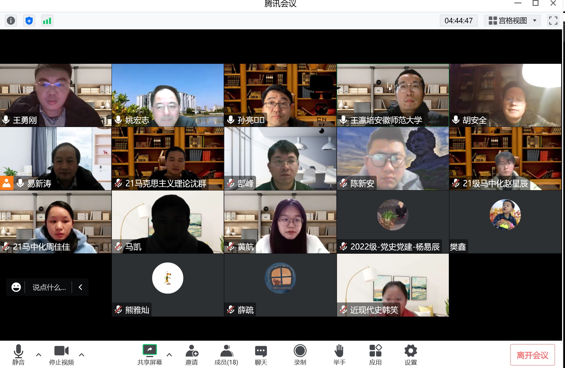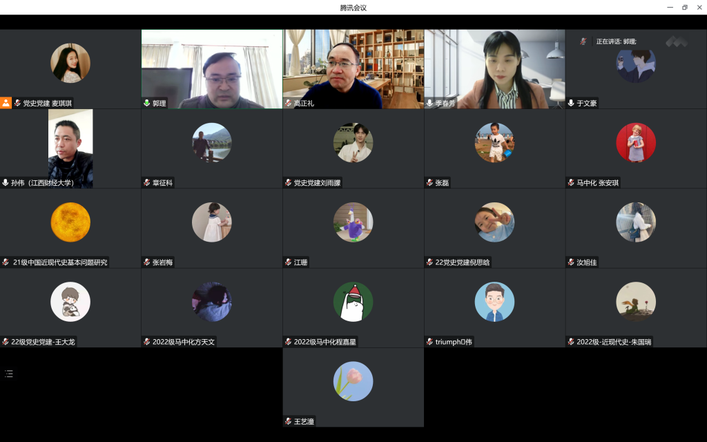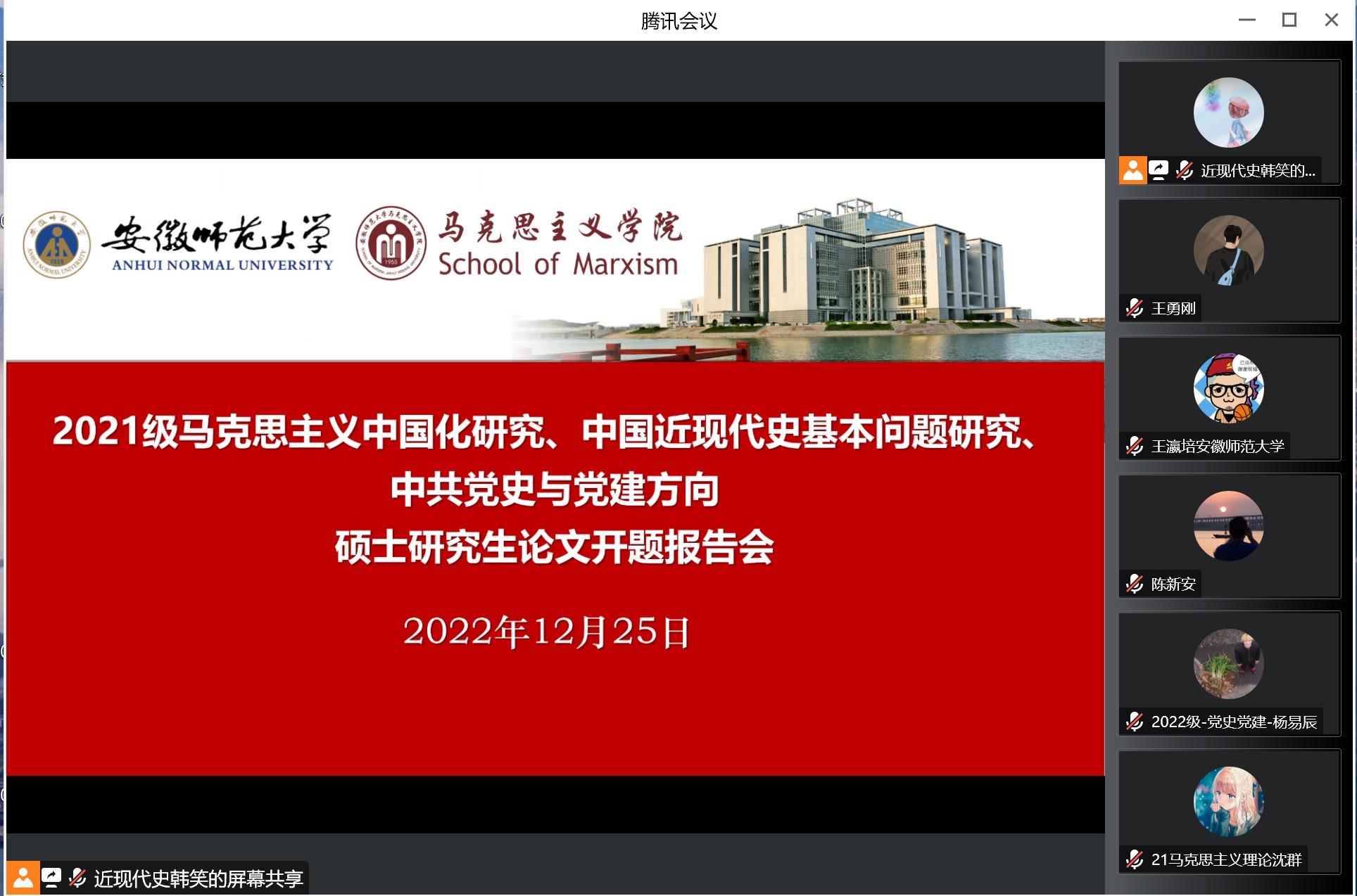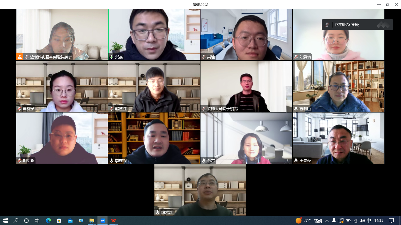 (本网讯)2022年12月25-26日,公司举办2021级马克思主义中国化研究、中国近现代史基本问题研究、中共党史与党建专业硕士研究生学位论文正式开题报告会。此次开题报告会分为四个小组,均采用线上方式进行,由张崇旺教授、孙伟教授、易新涛教授、魏志奇副教授担任各审核组组长,学位点全体硕士生导师担任此次论文开题报告会审核组成员,2022级全体同学线上观摩了此次论文开题报告会。