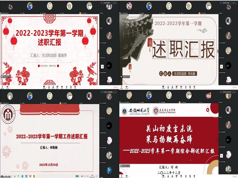 为总结员工会工作,促进新学期任务布置,12月30日下午,公司召开2022-2023学年第一学期beet365员工会述职评议汇报会。公司团委副书记陶娴静、公司研究生会主席团成员张猛、公司研究生会主席团成员韦孟雪、校员工会主席团成员吴佳怡担任评委,beet365团委员工会各部门负责人以及广老员工代表参加会议。本次会议由文体部部员陈楠楠主持。