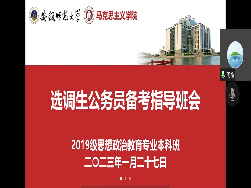为帮助班级同学全面了解省考以及选调生的考情政策和备考方法,辅导员周楠通过线上腾讯会议的形式开展“选调生公务员备考指导班会”。有意愿报名选调生公务员的毕业生参加班会。