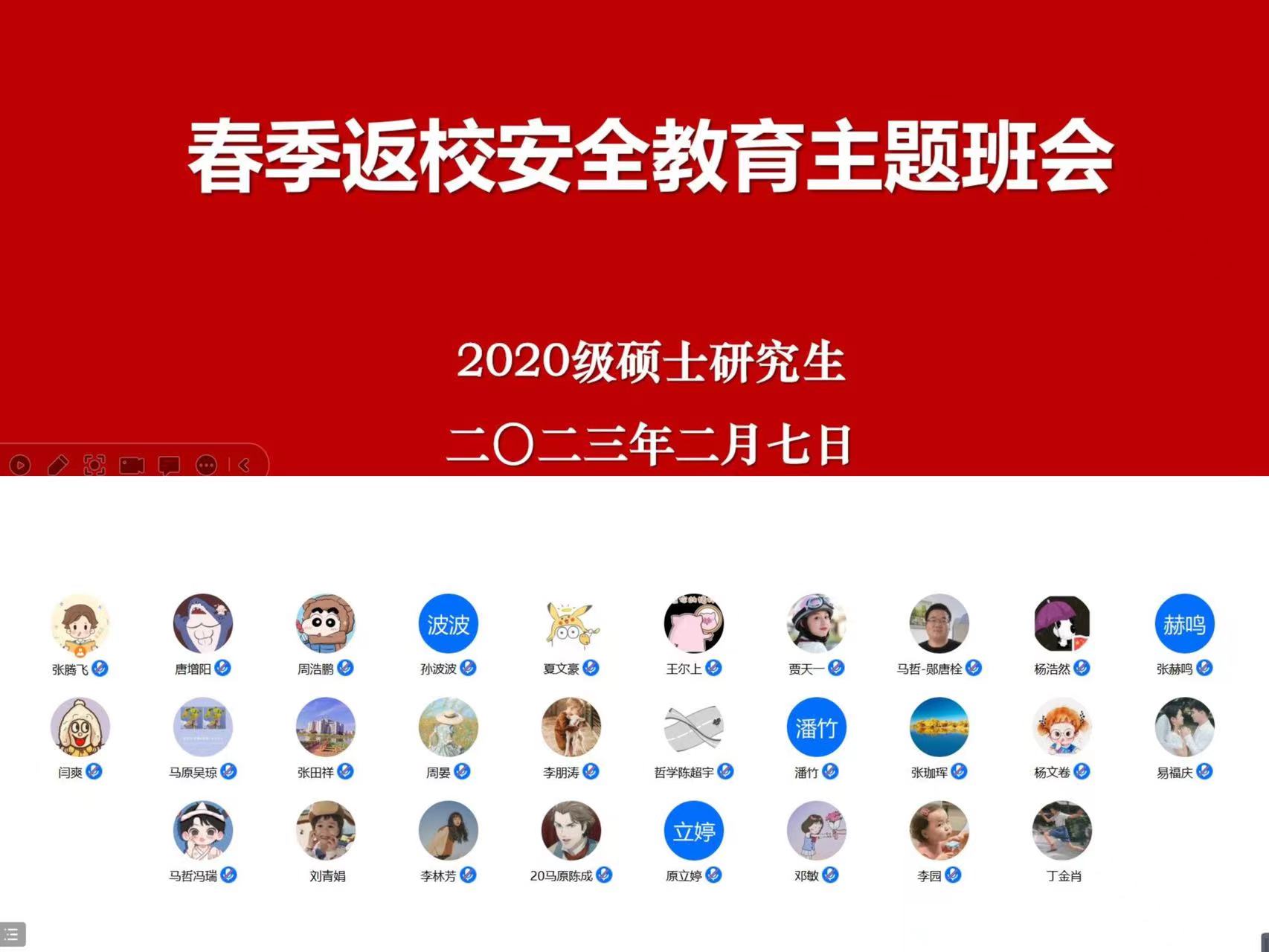 2月7日下午,公司2020级硕士研究生班级通过腾讯会议召开春季学期返校安全教育主题班会。会议由辅导员陶娴静主持,2020级全体硕士研究生参加。