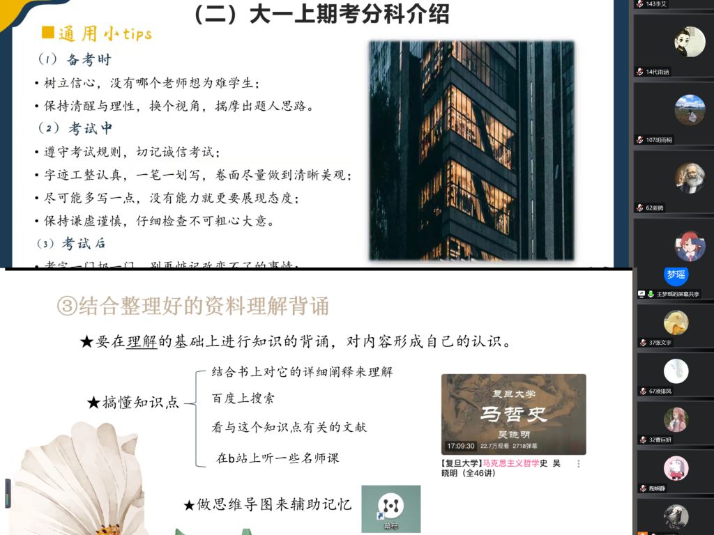 随后,2020级思政专业王梦瑶和2021级思政专业郭丙辰两位高年级同学围绕思政专业科目的复习方法进行针对性分析,将考前心态、考试流程、考试内容以及备考建议为同学们进行充分讲解,有力地增强了同学们考试信心。