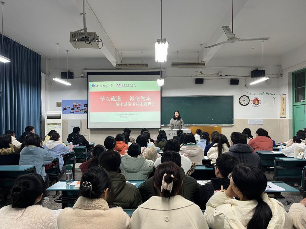 为加强考试管理,营造诚信应考氛围。2月18日晚,2022级思想政治教育专业于行知楼2020404、2020405教室开展期末诚信考试主题班会。会议由辅导员陶娴静主持,2022级思想政治教育专业全体同学参加。