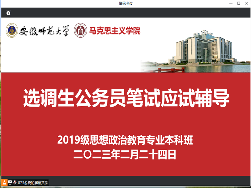 选调生、公务员考试在即,为提高员工笔试应试能力,2月24日,辅导员周楠通过线上腾讯会议的形式开展“选调生公务员应试辅导班会”。报考选调生、公务员的毕业生参加班会。
