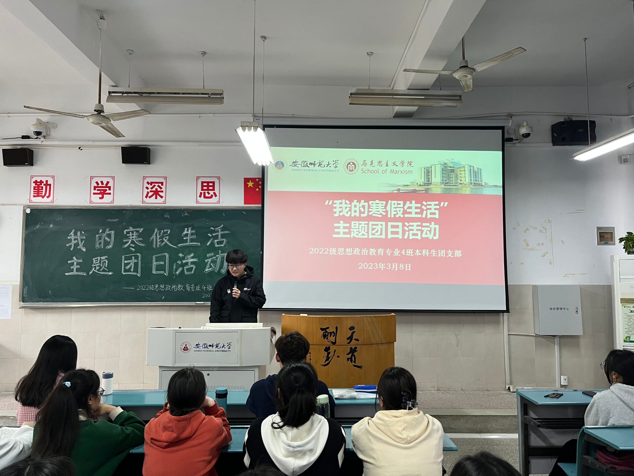 为弘扬雷锋志愿精神,助力公司进行文明创建,3月8日下午,公司2022级思想政治教育专业4班在行知楼2020404教室举办“我的寒假活动”主题团日活动。本次活动由团支书杨瑞主持,全体同学参加。
