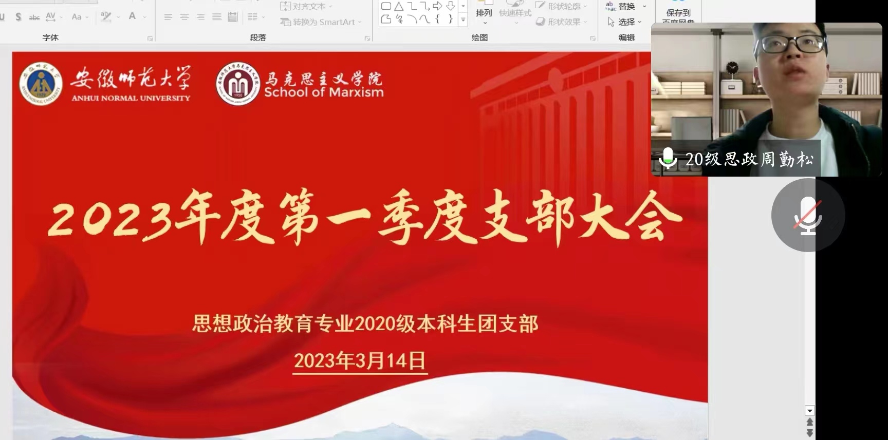3月14日晚,公司2020级思想政治教育专业本科团支部于线上召开了2023年度第一季度支部大会。会议由第二团支部书记周勤松主持,班级全体团员参加会议。