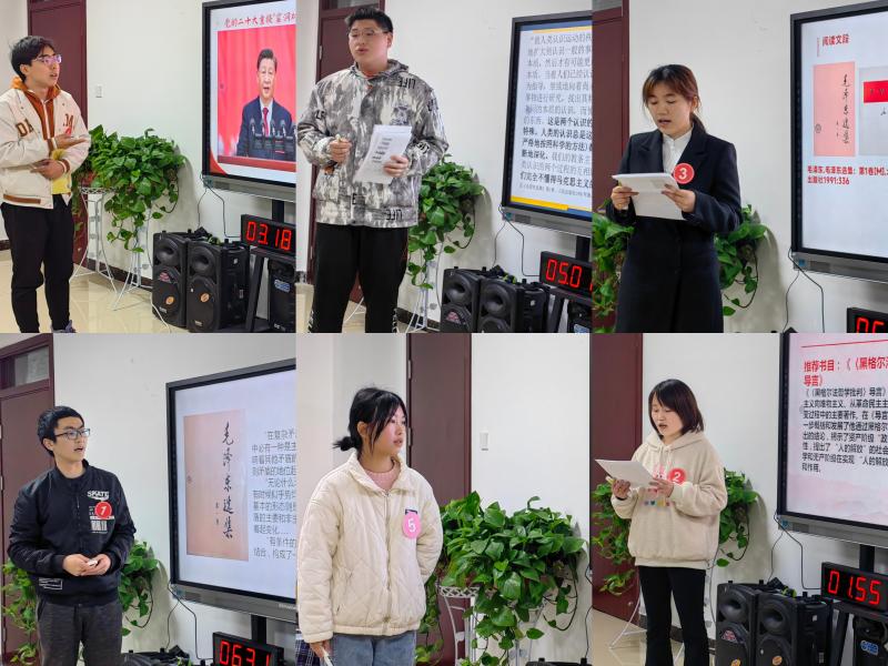 本次比赛一共分为两轮。第一轮为“品析经典,自我展示”,参赛选手们先有感情的朗读自己所选的文段,接着通过PPT阐述自己对指定书籍《矛盾论》的见解和感悟。在此之后,选手们另外推荐了一些经典书目,如《西西弗神话》和《中国近代史》等。通过文段朗读,感悟分享和书目推荐三个部分,选手们均展示了他们出色的表达能力以及对经典文本的理解能力。第二轮为“圆桌洽谈,思想碰撞”。评委老师们和选手一同围坐在圆桌旁,相互交流读书心得,通过提问加上答疑的方式共同解决读书过程中发现的问题。