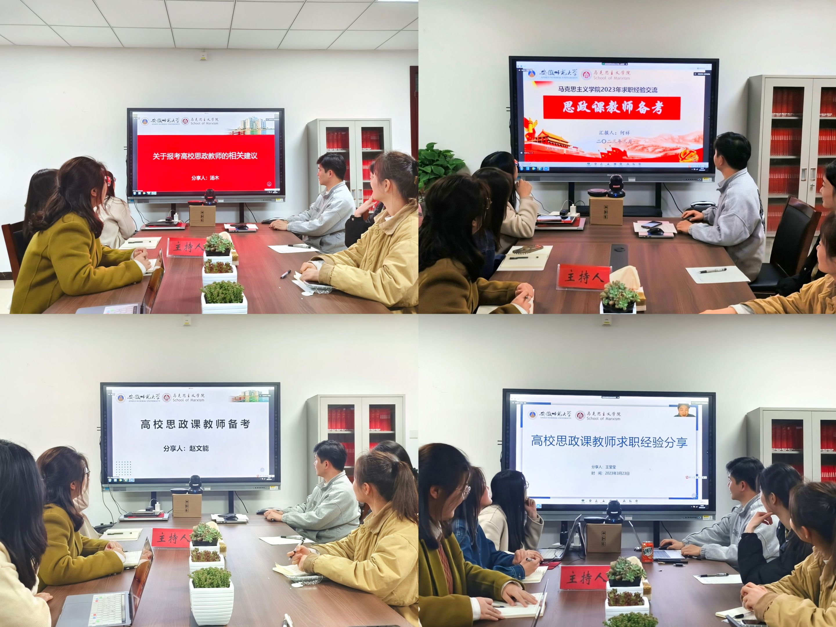 3月23日晚院研究生会于文典楼G217会议室举办高校思政课教师就业经验分享交流会。会议邀请了2022届优秀毕业生王莹莹、汤木、何祥、赵文能为同学们分享就业经验。会议由毕业班辅导员陶娴静主持,线下和线上共100余名同学参加。