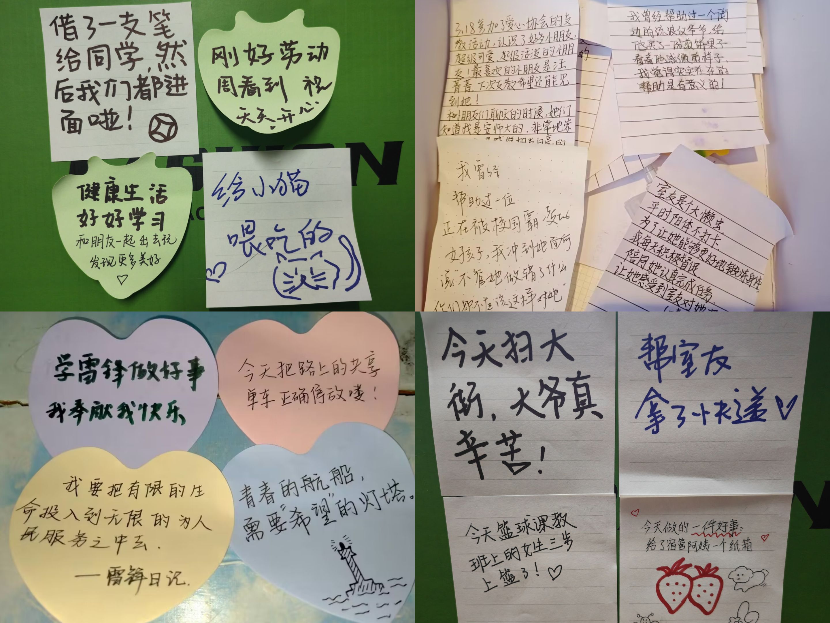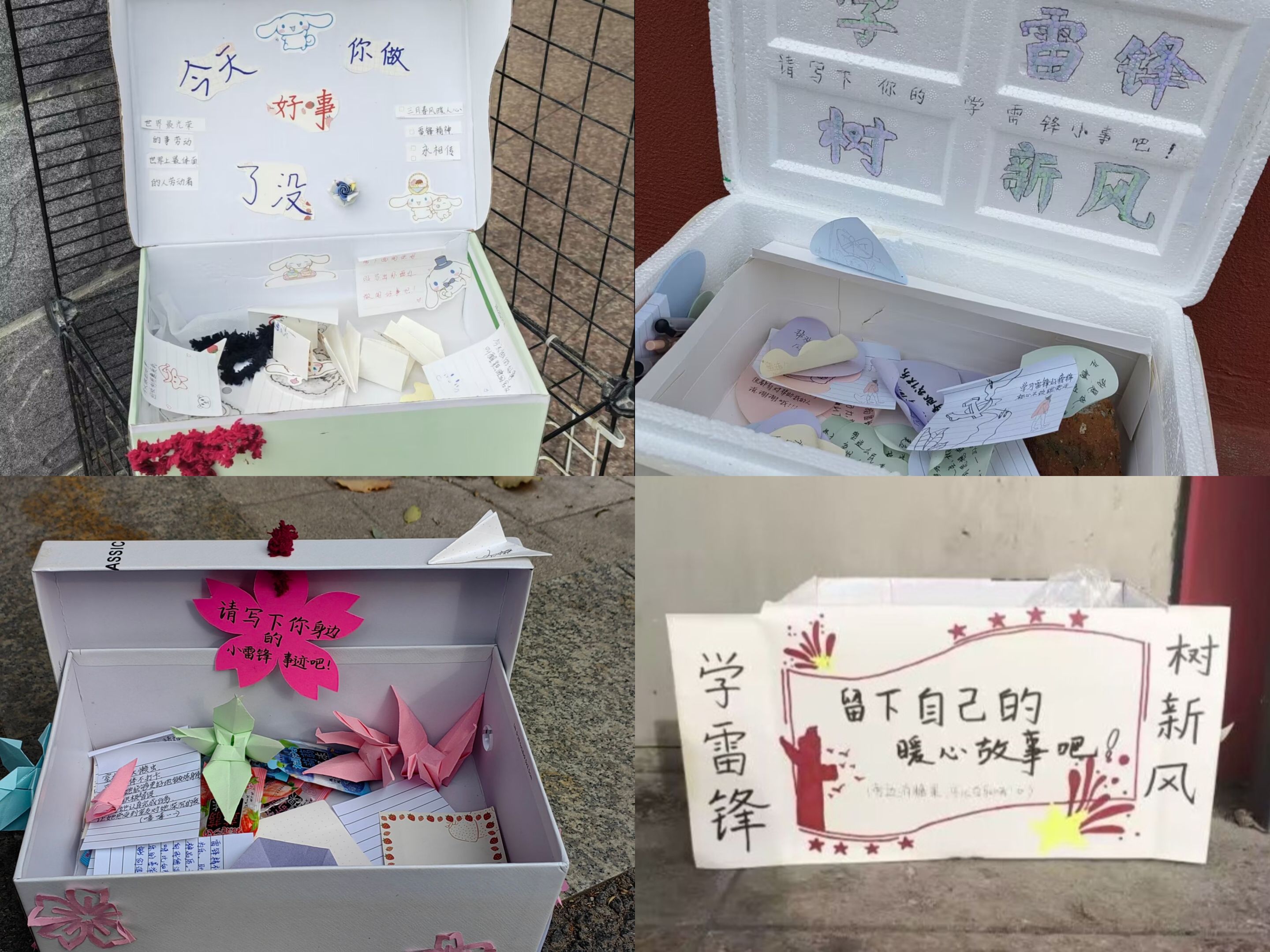留言纸箱温暖师大。以团小组为单位,各团小组组长带领同学们精心设计了四个纸箱,分别投放在校园内的四处角落,用投放纸条的形式在全校范围内收集同学们最近所做的好人好事以及助人为乐的暖心故事,使同学们在真切的文字中收获温暖与感悟,让雷锋精神在校园内得到广泛传播。