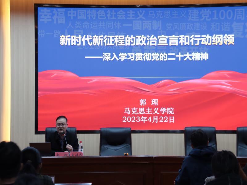 院副教授郭理老师以“新时代新征程的政治宣言和行动纲领”为题宣讲了党的二十大精神。他以“三个事关”为线索,引出党的二十大的重要地位,分析了二十大报告的篇章结构;以“五个牢牢把握为主线”,总结历史经验,分析当下国情,并指出青年一辈要掌握理论方法,坚定理想信念,为建设社会主义现代化国家,全面推进中华民族伟大复兴贡献青春力量;以“二十大中的创新点”为结尾,启发同学们要多角度思考,进一步阐述了当今要不断学习党的二十大精神的必要性。