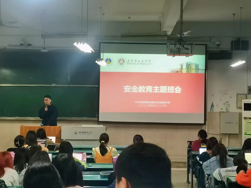 4月26日晚,2021级思想政治教育专业教学1班在行知楼2020203召开安全教育主题班会。辅导员沈镇主持会议,全体同学参加会议。