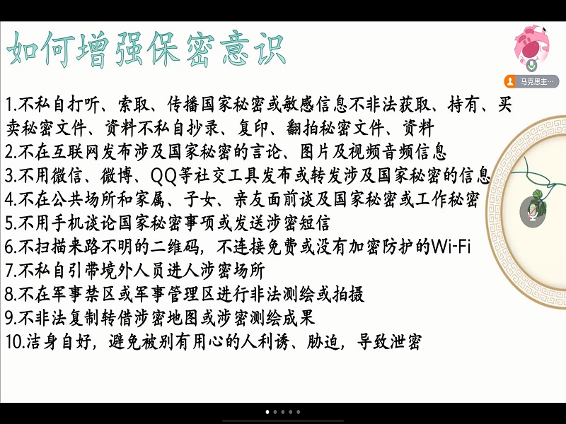 5月2日晚,2021级思想政治教育专业教学一班在线上开展“增强保密意识,筑牢安全防线”主题团日活动。本次团日活动由团支书黄婉清主持,教学一班全体同学参加会议。