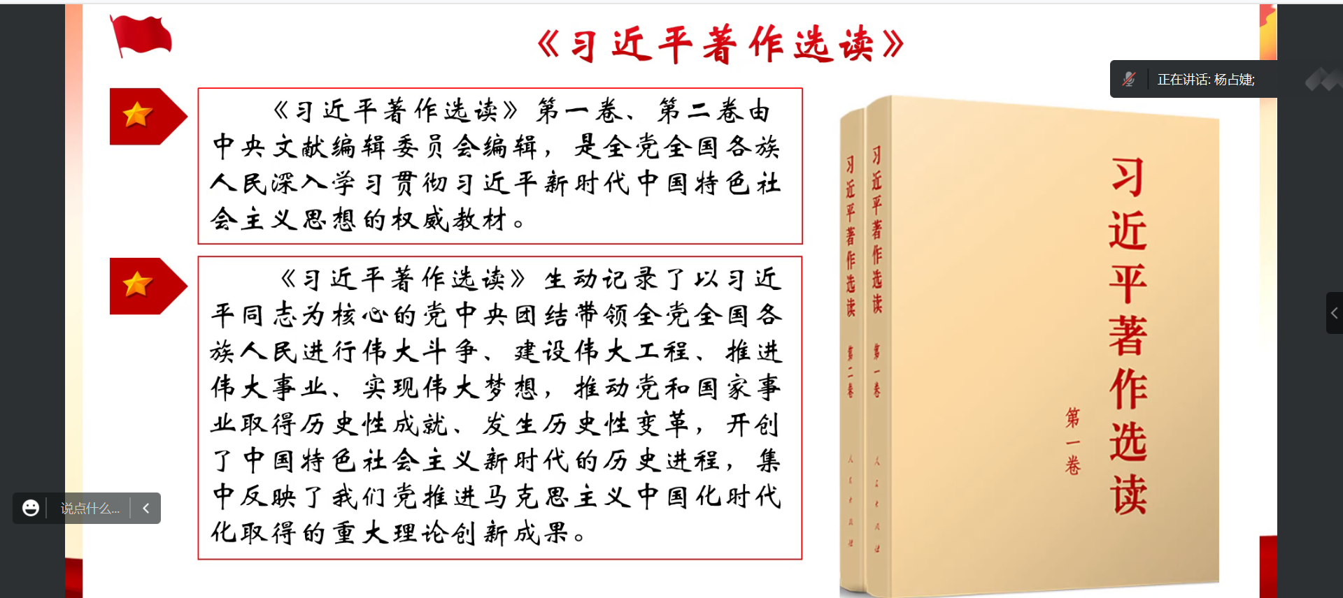 本次五四主题系列团日活动围绕习近平新时代中国特色社会主义思想内容展开。周勤松向同学们推荐了《习近平著作选读》《论党的自我革命》《习近平新时代中国特色社会主义思想专题摘编》等六部著作,介绍了每本书的主要内容和学习价值。杨占婕接着进行重点书目讲解,重点解读了《习近平著作选读》,介绍其主要内容和重要观点。