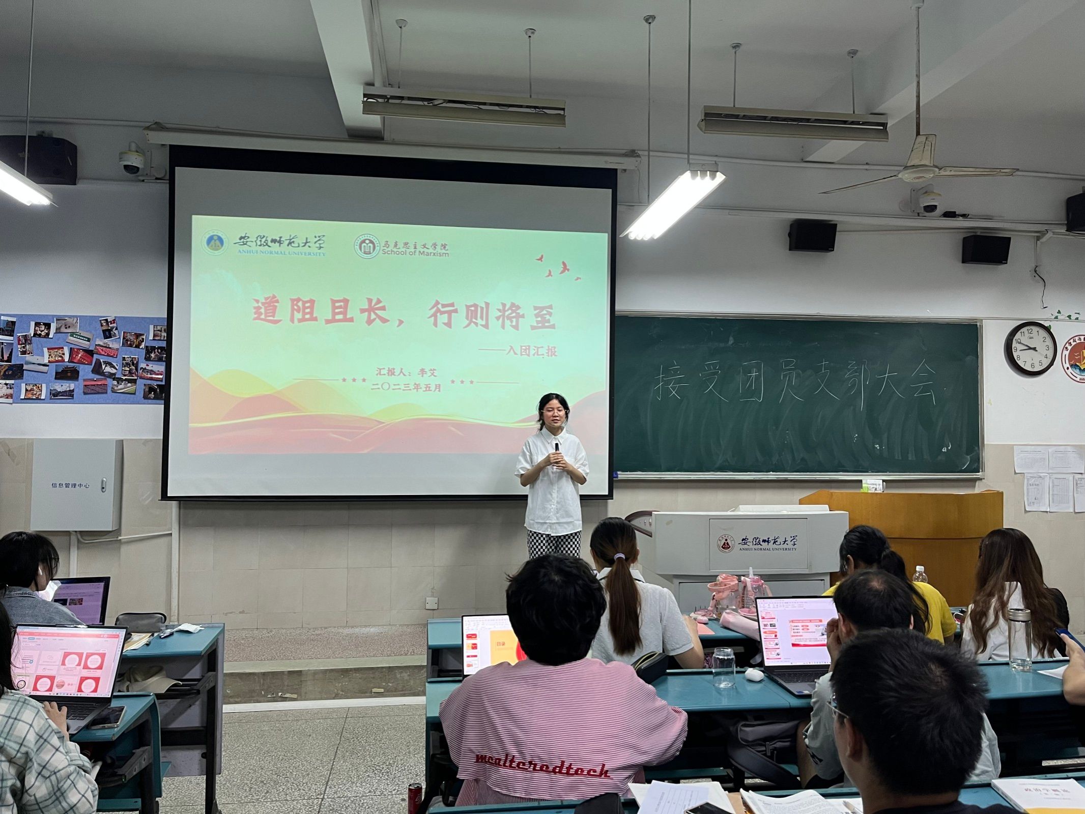 班级组织委员程惠报告发展人名单和到会情况。杨瑞带领全体团员齐唱中国共产主义青年团团歌。入团申请人李艾围绕思想建设、学习情况、任职工作和实践活动四个部分进行入团答辩汇报,表达了入团的坚定信念和为团组织贡献的决心,承诺今后将以更高的标准来要求自己。汇报结束后,杨瑞代表支部委员会报告对申请人的审议意见,组织收到李艾的入团申请书后,听取入团联系人、团员和群众的意见,对李艾进行了全面考察,经报请上级团组织备案、批准。全体团员围绕李艾是否具备入团条件进行充分讨论并开展了无记名投票。经统计,全体团员同意其发展为共青团员。最后,杨瑞宣读支部大会决议草案,大会同意吸收李艾为共青团员。