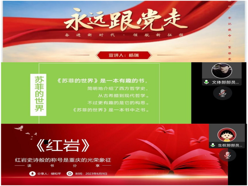 员工会文艺体育部负责人程嘉怡带领参会人员学习了党的二十大报告中的新观点、新论断、新思想、新战略和新要求,参会人员对此进行了热烈的讨论,并互相交流了感想。随后,杨瑞、俞浩、储和平分别进行了读书感悟汇报。杨瑞以“奋进新时代,领航新征程”为主题,介绍了青年的使命,提出广大青年要与民族同命运、与祖国共奋进、与时代齐发展;俞浩带领大家探索了《苏菲的世界》中的哲学道理;储和平则借《红岩》中江姐的故事进一步说明了坚定理想信念的重要性,要不断强化责任担当、勇于攻坚克难、不懈奋斗。在分享阅读书籍的过程中,参会人员也纷纷发表自己的理解和思考,引起了广泛的共鸣。