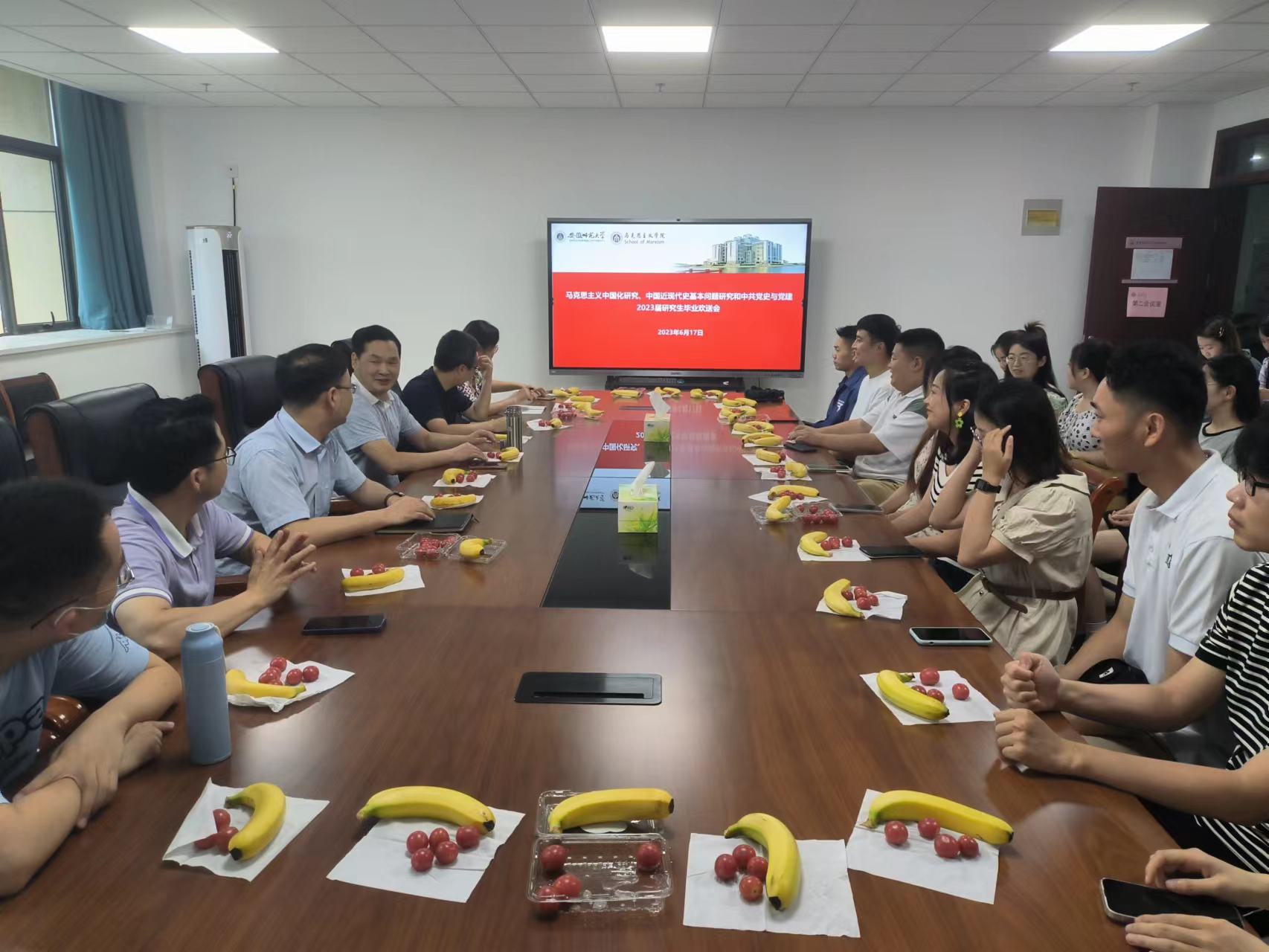6月17日下午,马克思主义中国化研究、中国近现代史基本问题研究和中共党史与党建硕士点举行2023届硕士研究生毕业欢送会,此次欢送会由沈燕培教授主持,李祥兴教授、章征科教授、崔明海副教授、郭理副教授、孙亮副教授、王瀛培副教授作为导师代表参加,马克思主义中国化研究、中国近现代史基本问题研究和中共党史与党建硕士点毕业生、2021级和2022级硕士研究生代表参加此次活动。