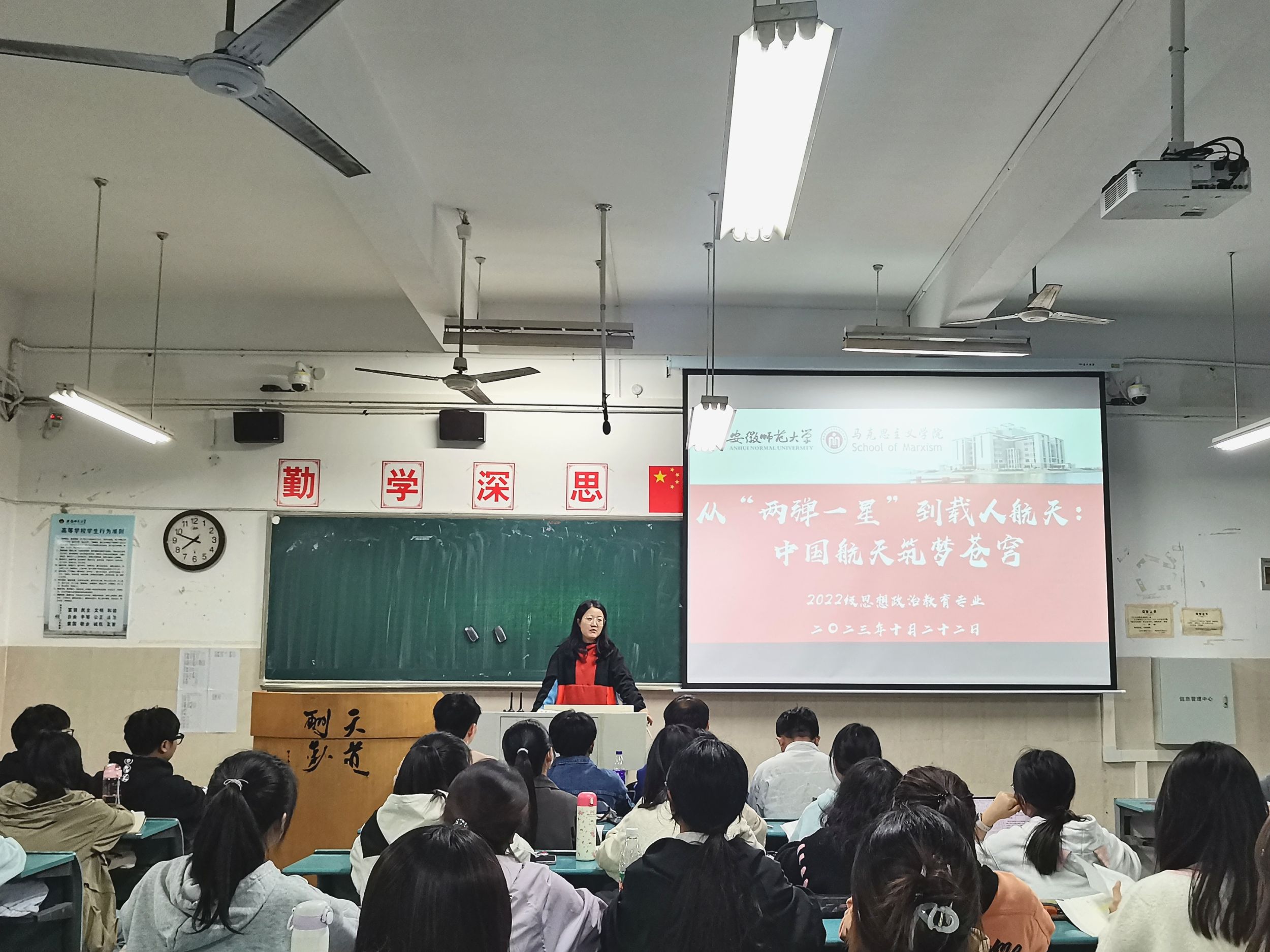 10月22日晚,2022级思想政治教育(师范)专业开展从“两弹一星”到载人航天:中国航天筑梦苍穹主题教育班会。会议由陶娴静主持,全体同学参加。
