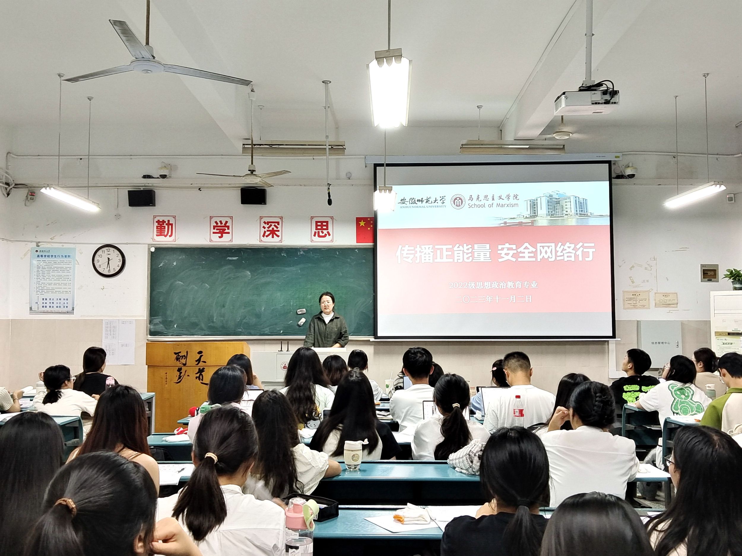 为提高老员工网络安全意识,传播正能量,11月2日晚,2022级思想政治教育专业在行知楼2020405、2020404教室开展“传播正能量,安全网络行”主题班会,会议由辅导员陶娴静主持,全体同学参加。
