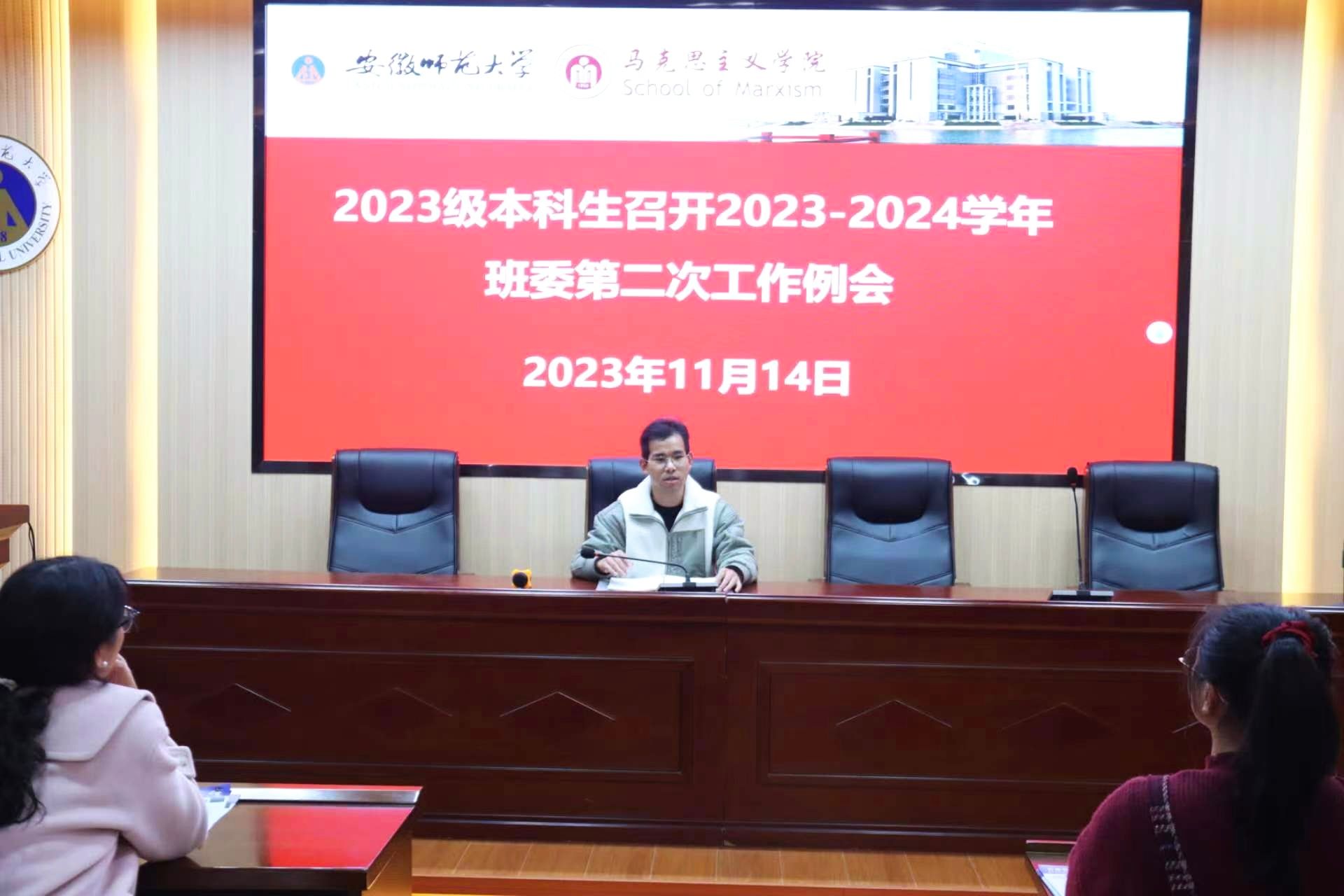 为加强员工干部队伍建设,11月14日晚,2023级在马克思主义公司108教室召开2023-2024学年第二次班委工作例会。会议由辅导员王梦雨主持,全体班委参加。