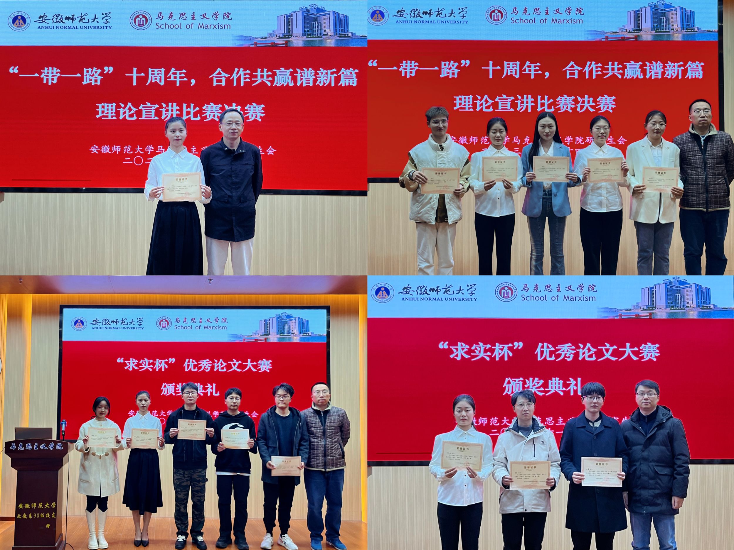 最后,此次比赛共评选一等奖1名,二等奖2名,三等奖3名,优秀奖4名。陈勇、王瀛培、陈冬冬三位老师分别为宣讲比赛获奖者以及“求实杯”优秀论文大赛获奖者颁发证书,并与所有参赛选手合影留念。