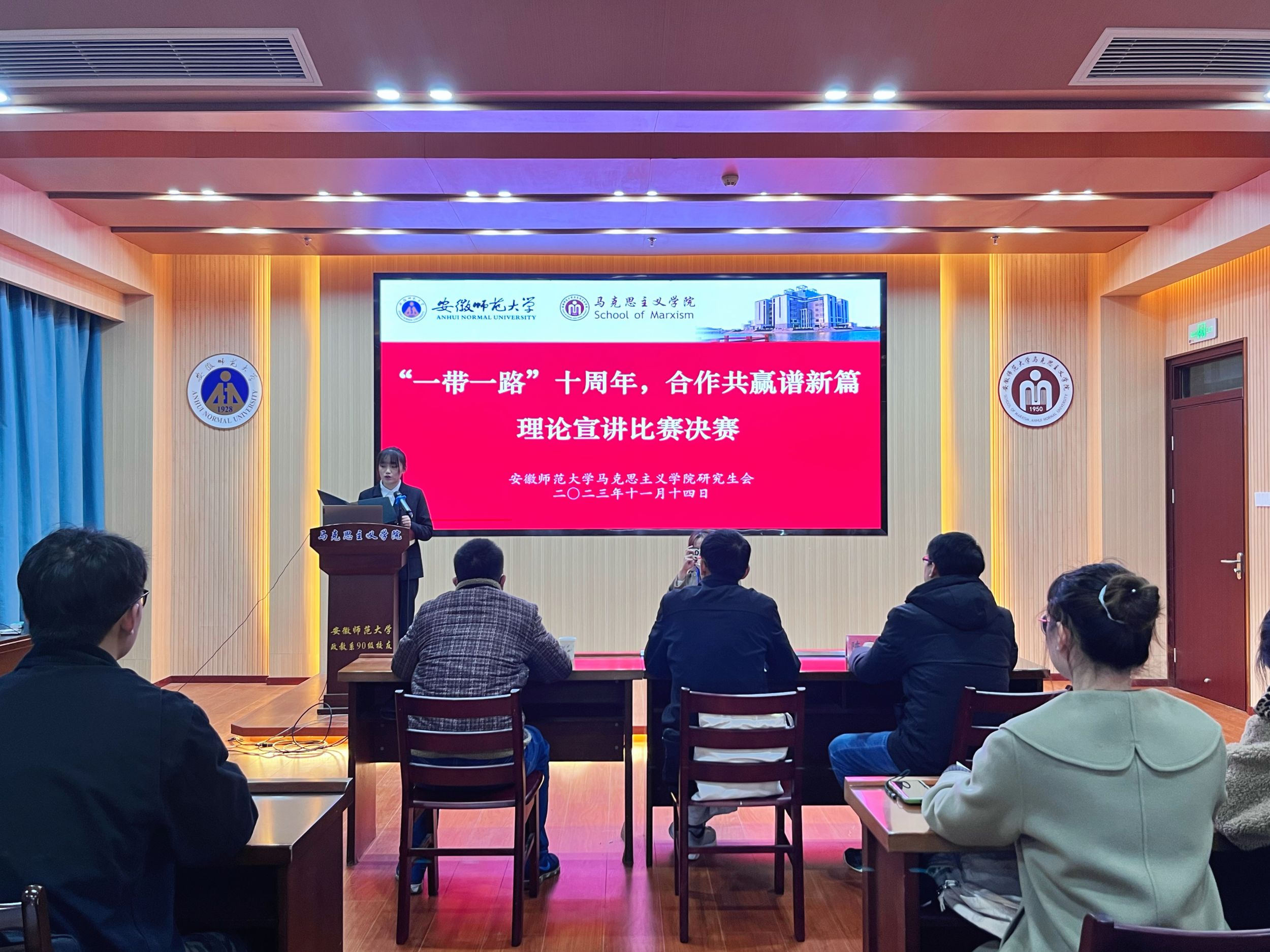11月14日晚,院研究生会在文典楼G108报告厅举办“一带一路十周年,合作共赢谱新篇”理论宣讲比赛决赛。比赛邀请公司陈勇、王瀛培、陈冬冬三位老师担任评委,会议由实践部委员徐荔萍主持。