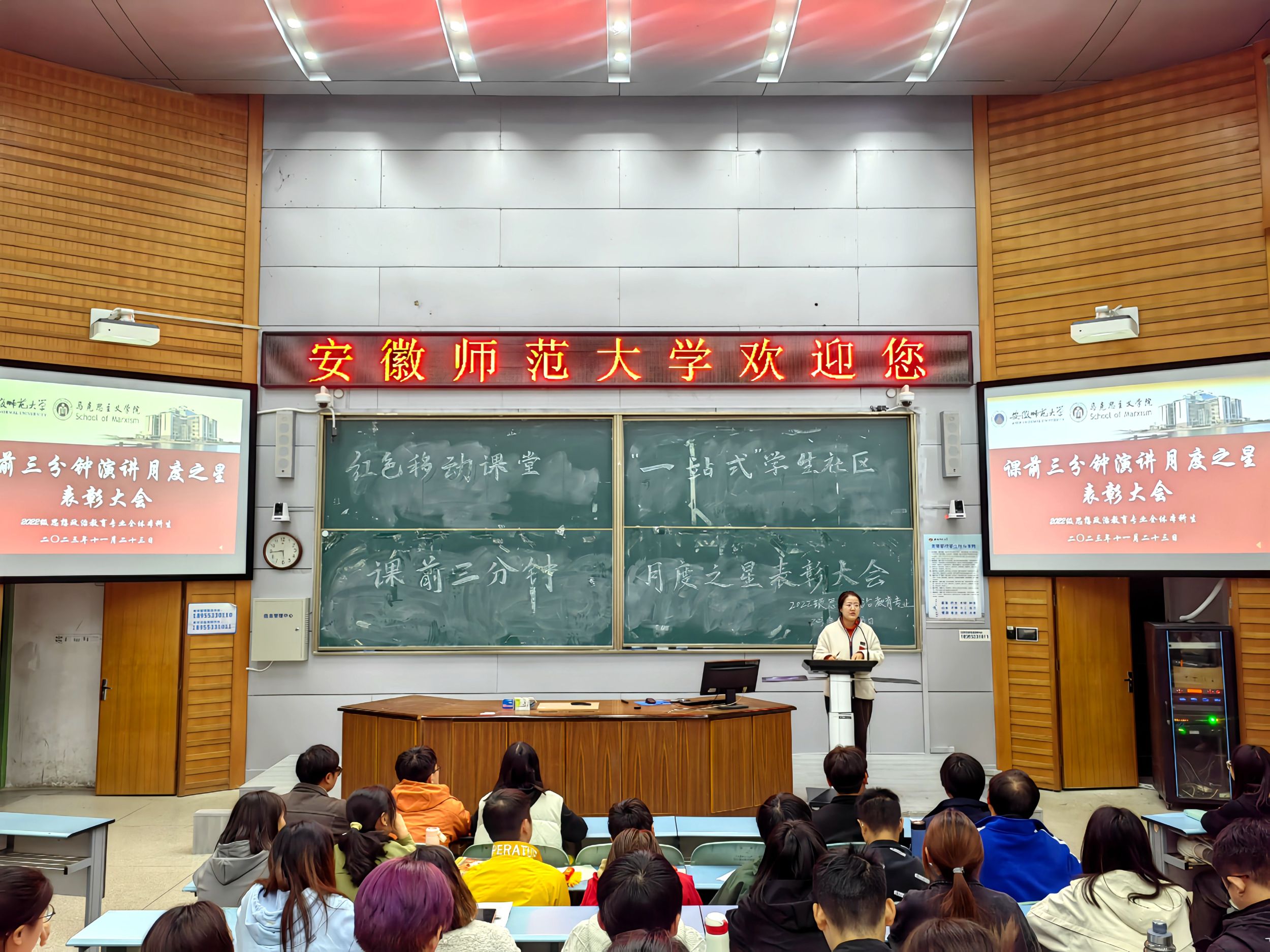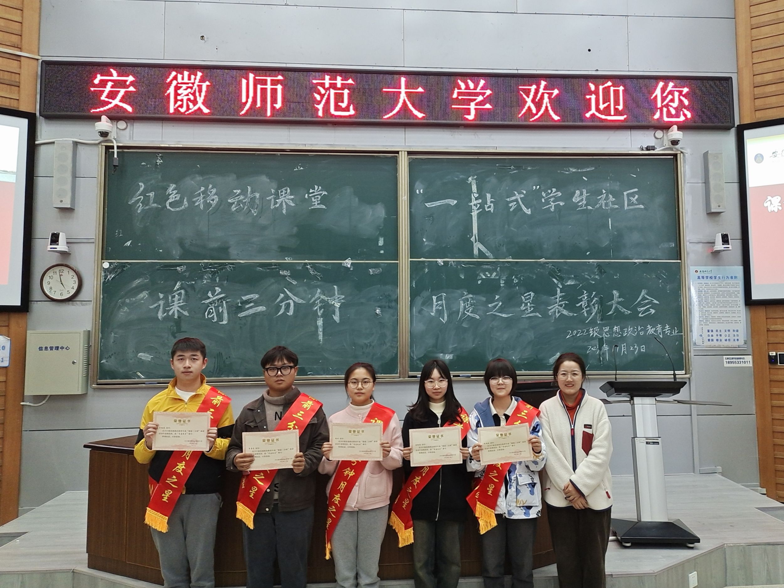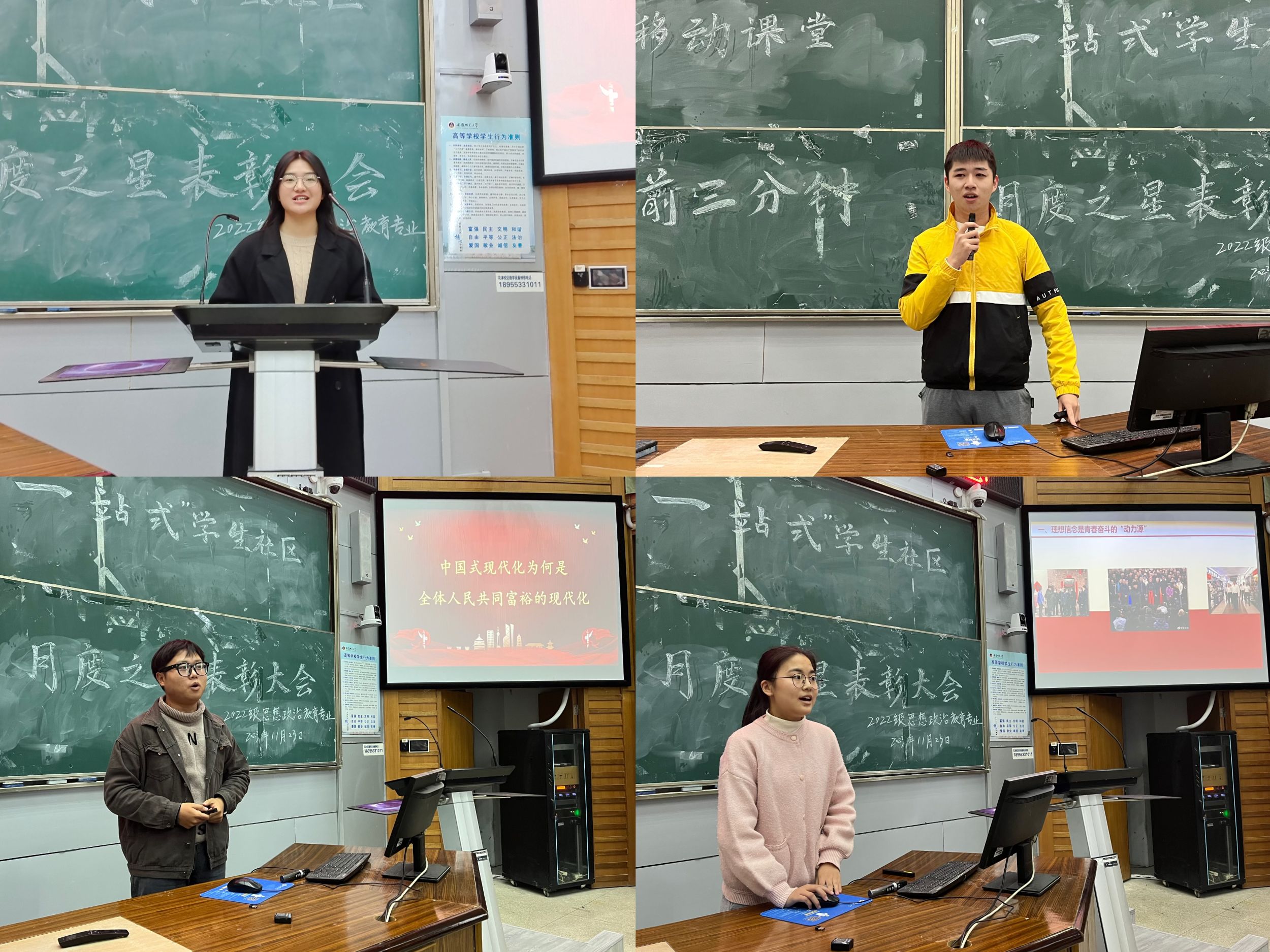 11月23日下午,2022级思想政治教育专业于行知楼2010105教室开展“一站式”员工社区课前三分钟演讲月度之星表彰大会,会议由蒲少华主持,全体同学参加。