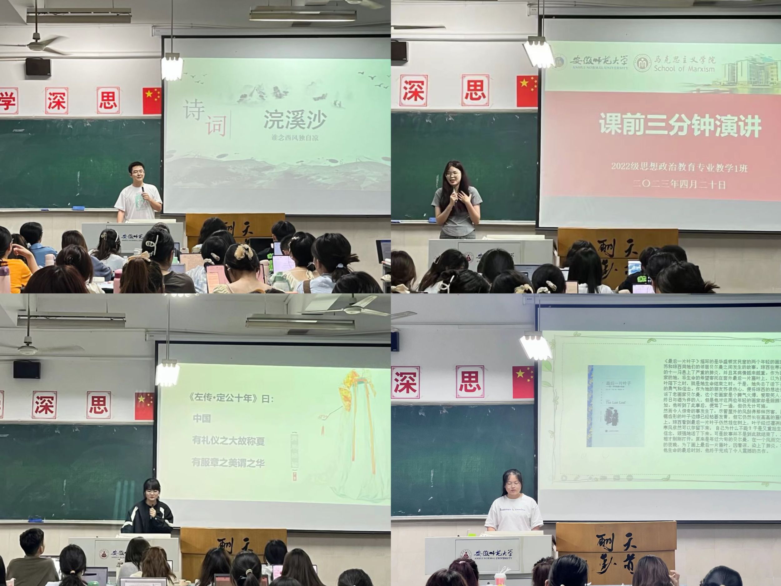 同学们自由选择主题,认真准备课件,在一次次的讲述中逐步提升口才和应变能力,增长授课经验。经过班级评议小组综合评定,代雨涵、吴俊豪等10位同学获得课前三分钟演讲月度之星称号,李睿青、吴俊豪、陈巧3位同学现场进行授课演示,展现师范生的独特风采。