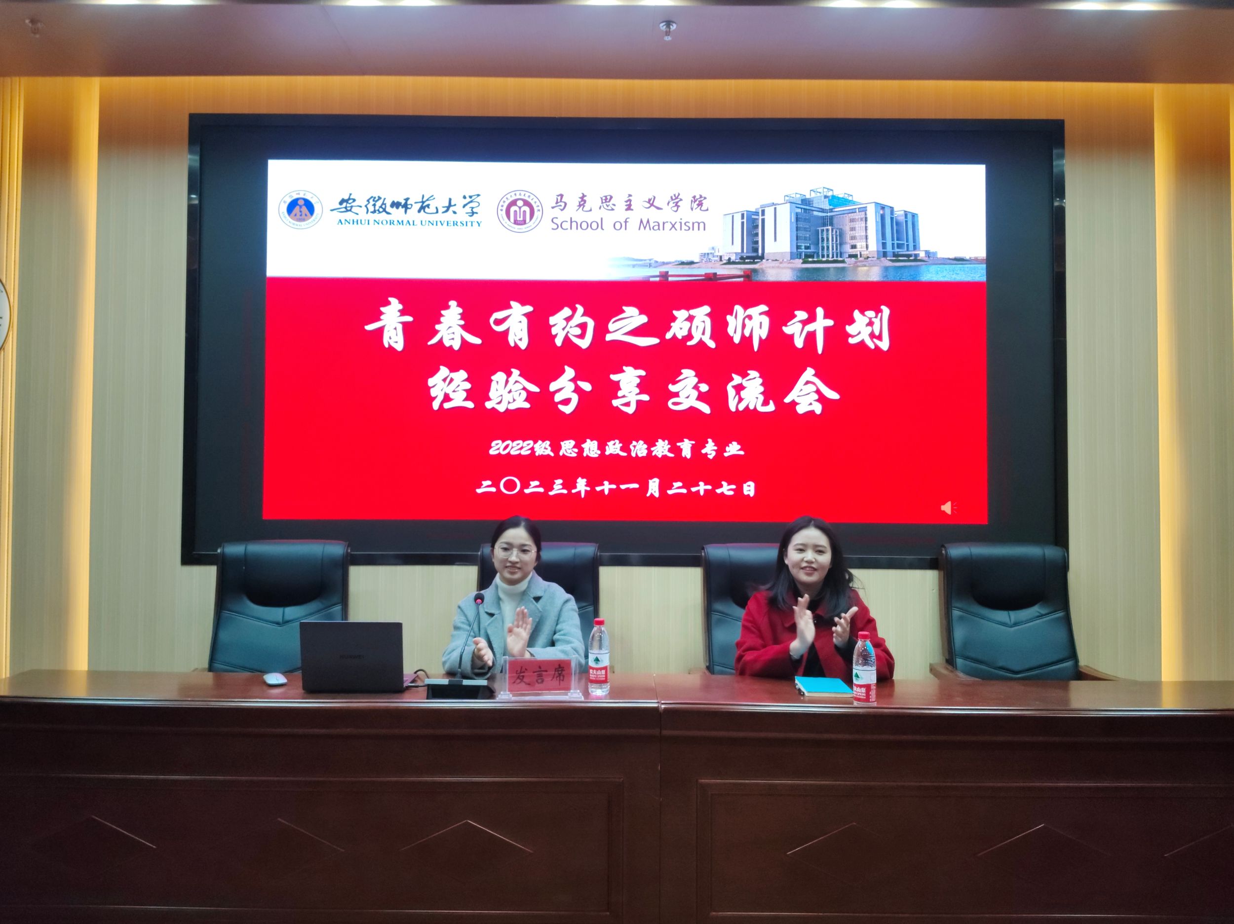 11月27日晚,公司2022级思想政治教育专业在文典楼G108会议室开展青春有约之硕师计划经验分享交流会,2020级本科生乔婷婷、孙迅应邀主讲,会议由团支书倪名明主持。
