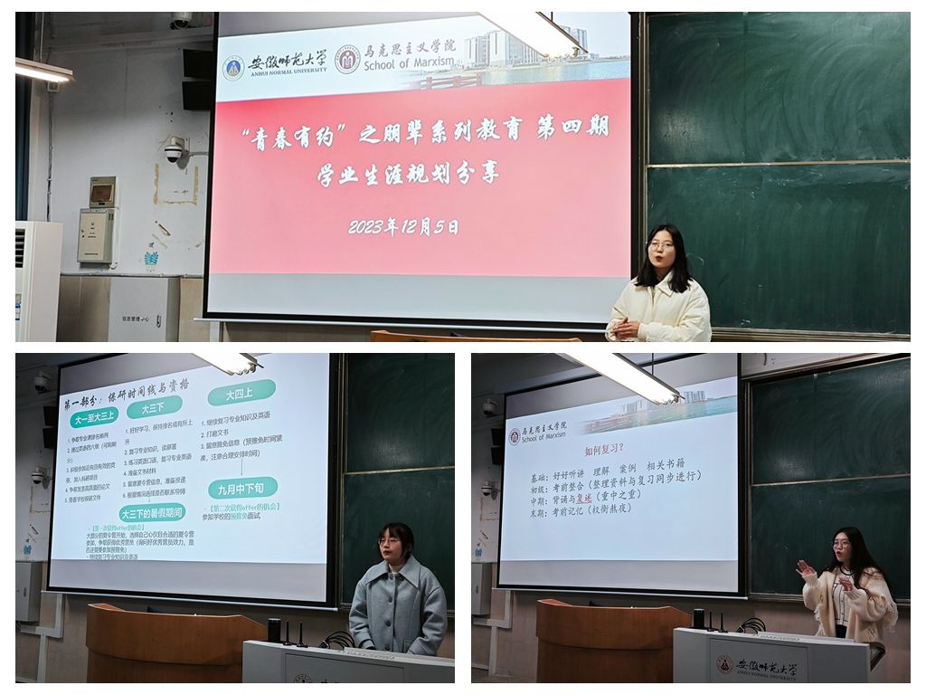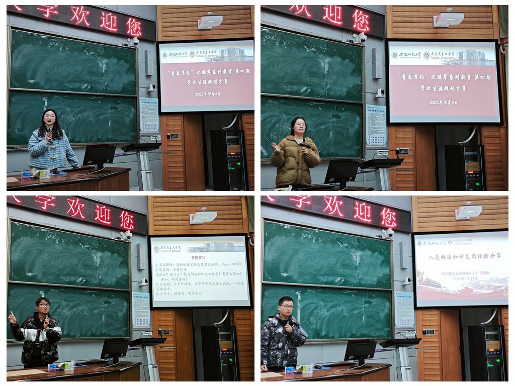 为帮助2023级本科新生做好大学学业生涯规划,12月4日-5日, 马克思主义公司在2010105、2020204教室开展了第四期“青春有约”之老员工涯规划交流分享会。会议邀请2020级乔婷婷、周勤松、俞晶晶、应雨萱、张钰珩、时可、杨占婕等优秀学长学姐交流分享,全体新生参与。