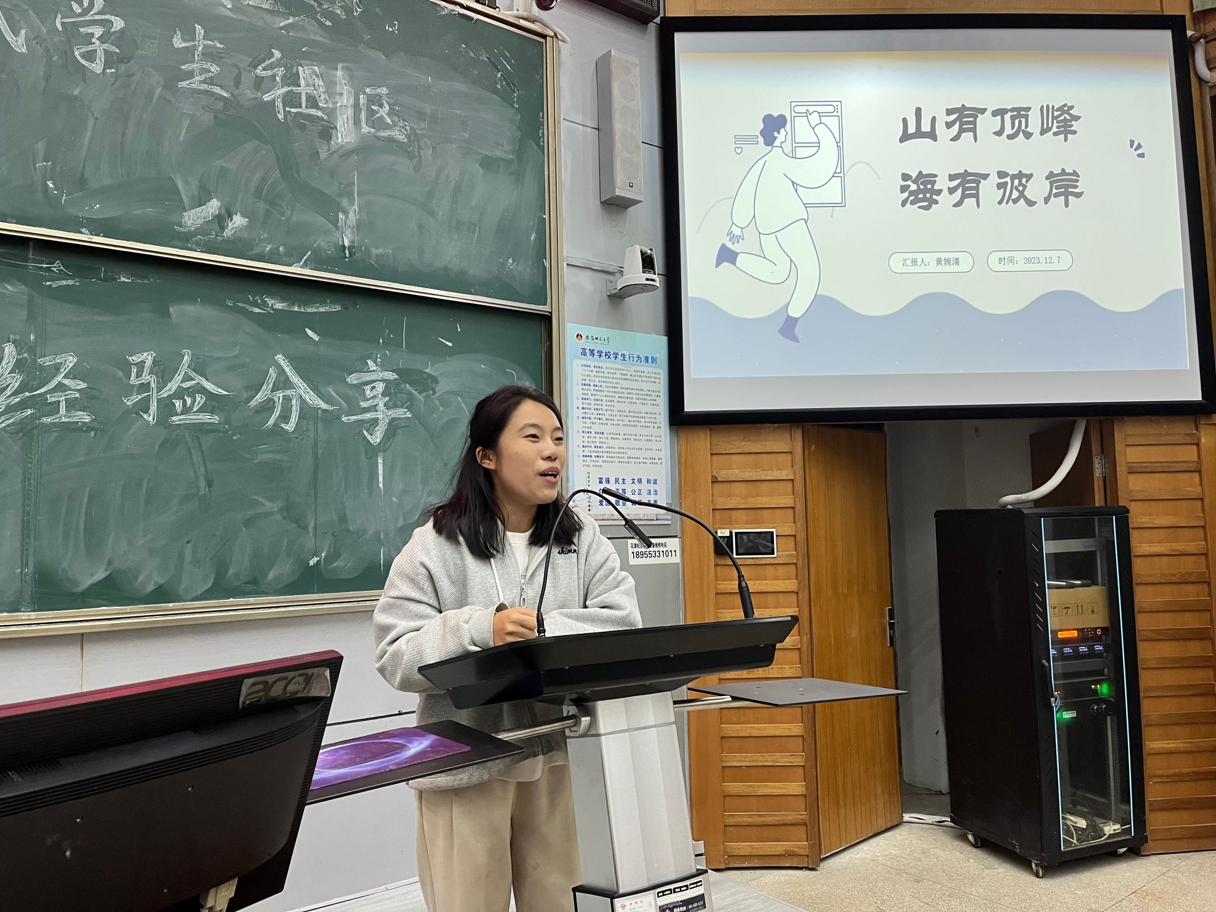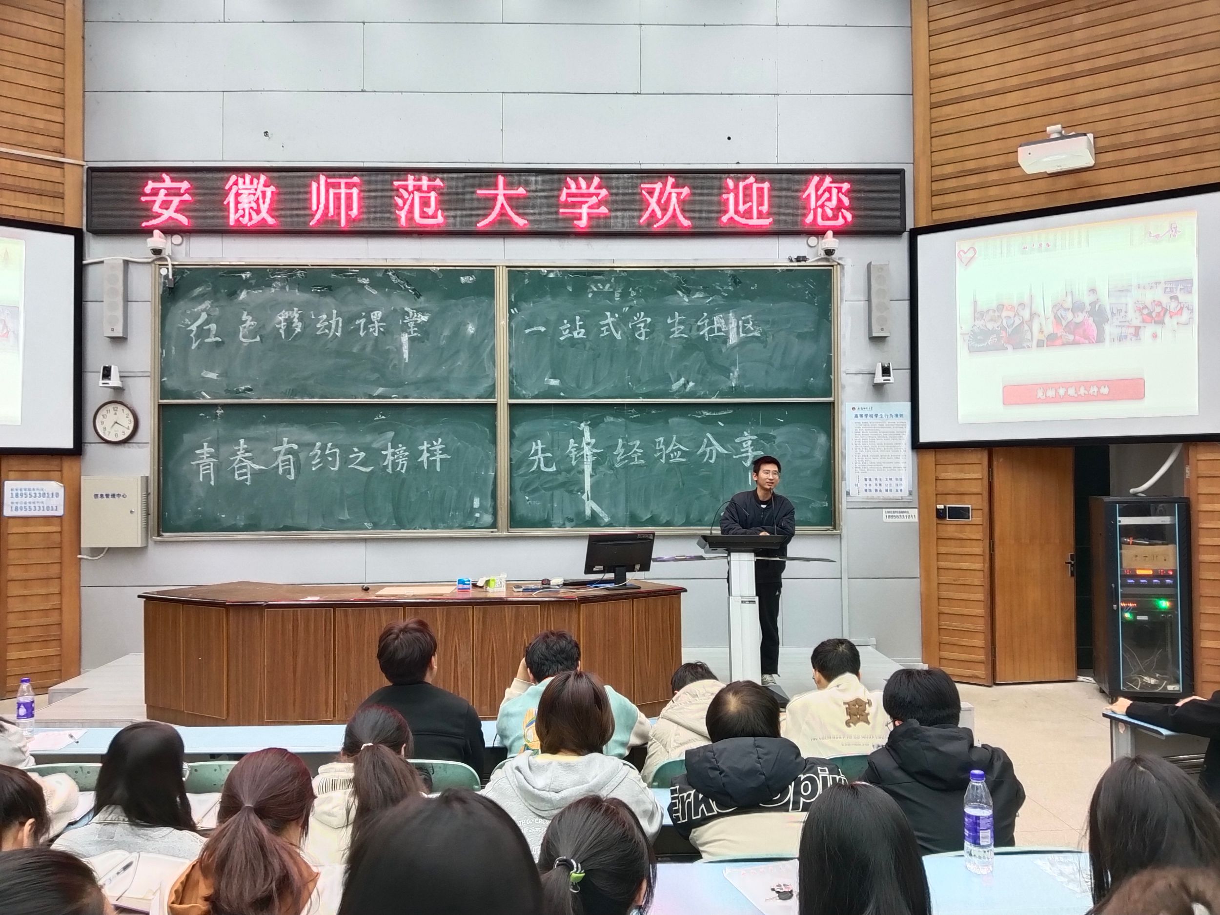 分享会上,骆鹏晟向大家分享了他的志愿服务经验。他详细讲述了如何寻找合适的志愿服务以及芜湖市内志愿服务活动信息。他强调,参与志愿服务不仅能帮助他人,也是提升自身社会责任感和公民意识的重要途径。随后,黄婉清向大家分享了她的学习经验和竞赛心得,并详细介绍了如何取得优秀的考试成绩,以及参加各类竞赛的经验。她还特别强调了期末考试前的复习策略和技巧,为同学们提供了宝贵的参考。两位主讲人的分享内容丰富多样,深入浅出,同学们和学长学姐互动频繁,现场气氛热烈。