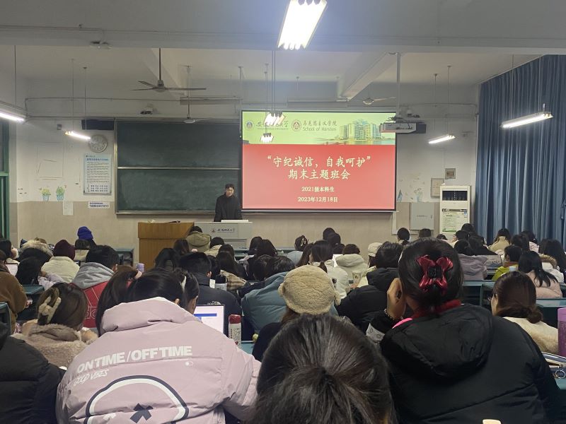 为提高员工安全防范意识,推动期末考试相关工作顺利展开,12月18日下午,2021级本科生在2020203教室召开主题为“守纪诚信,自我呵护”的期末主题班会。本次班会由辅导员沈镇主持,全体同学参会。