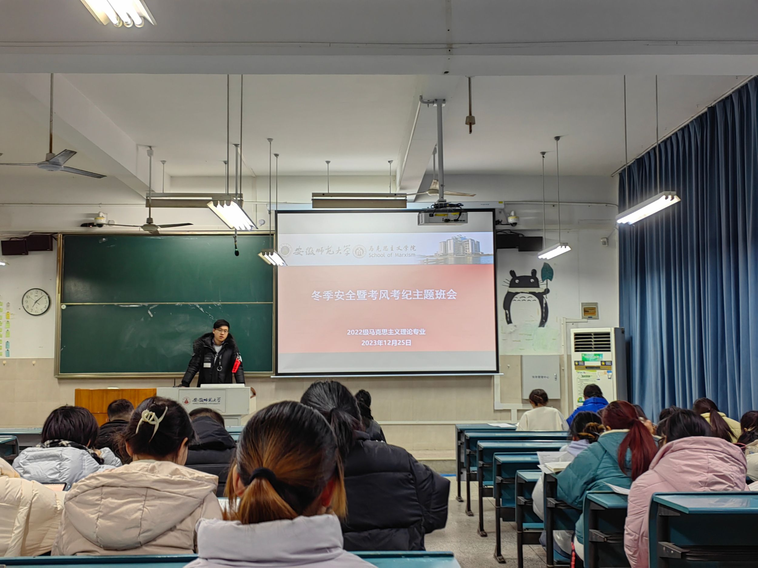 为进一步强化员工安全防范意识,端正考风考纪,增强员工诚信考试意识,12月25日晚,2022级马克思主义理论专业在行知楼2020303教室召开冬季安全暨考风考纪主题班会,会议由辅导员季行健主持,2022级马克思主义理论专业全体同学参加。
