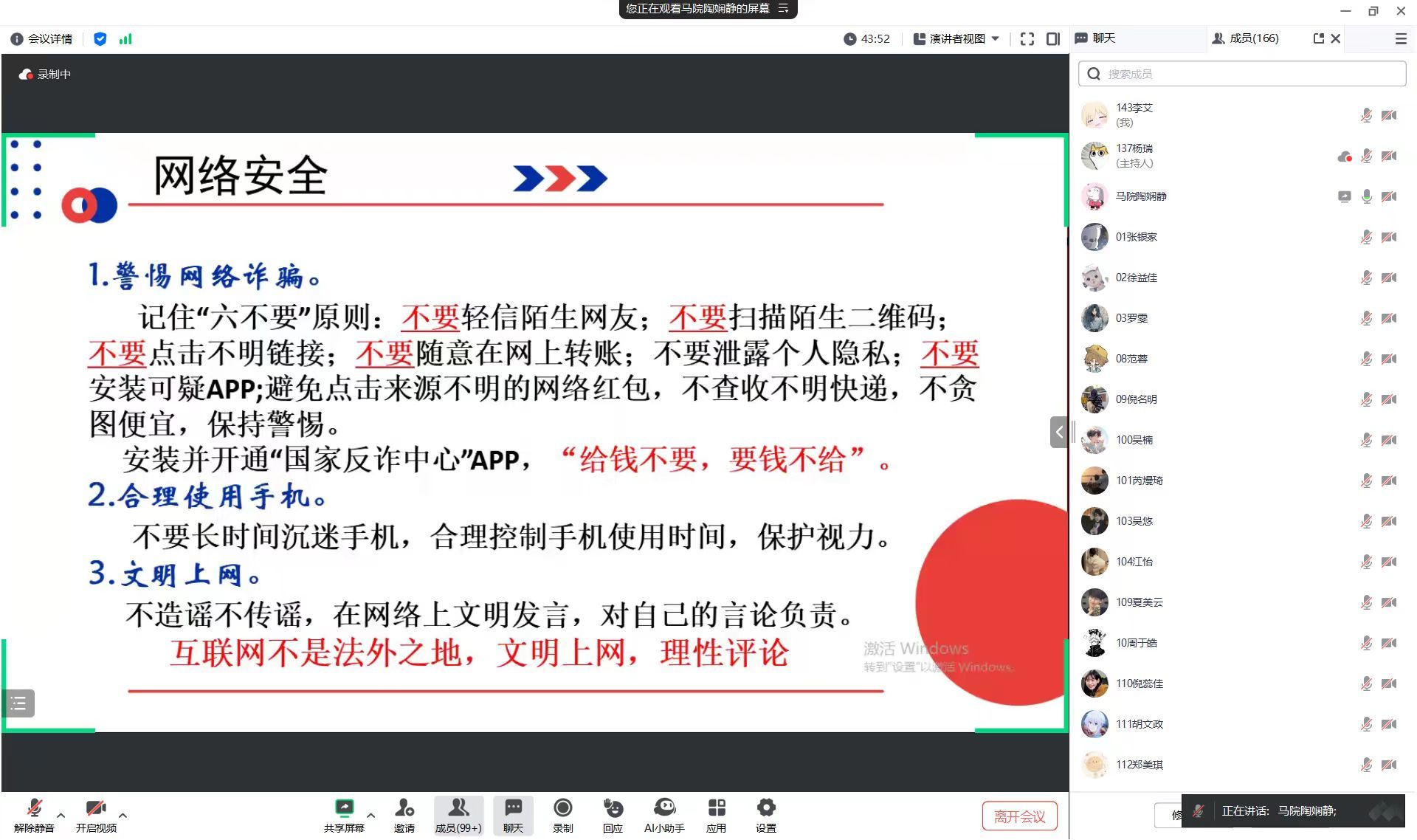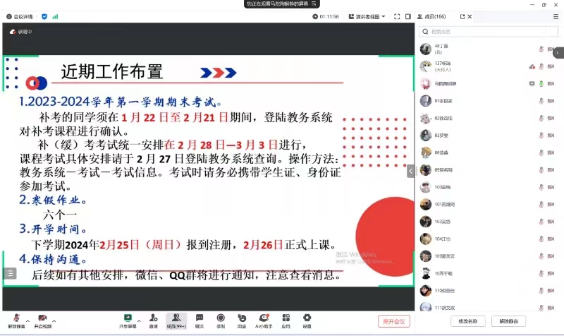 会上,陶娴静分别从消防安全,网络安全、交通安全、近期工作布置等四个方面展开阐述,提醒同学们冬季是火灾易发季节,要求同学们掌握冬季火灾逃生知识,加强安全防范。同学们要安全上网,保护个人隐私,切勿轻信未知网站信息,严防各类网络诈骗。她提醒同学们假期出行注意安全,遵守交通法规,争做文明出行人。此外,陶娴静对期末成绩查询、确认补考课程、寒假作业及开学时间等事宜进行相关布置和安排,她鼓励同学们假期期间要加强相互交流与联系,如家庭遇突发情况可以及时告知老师。