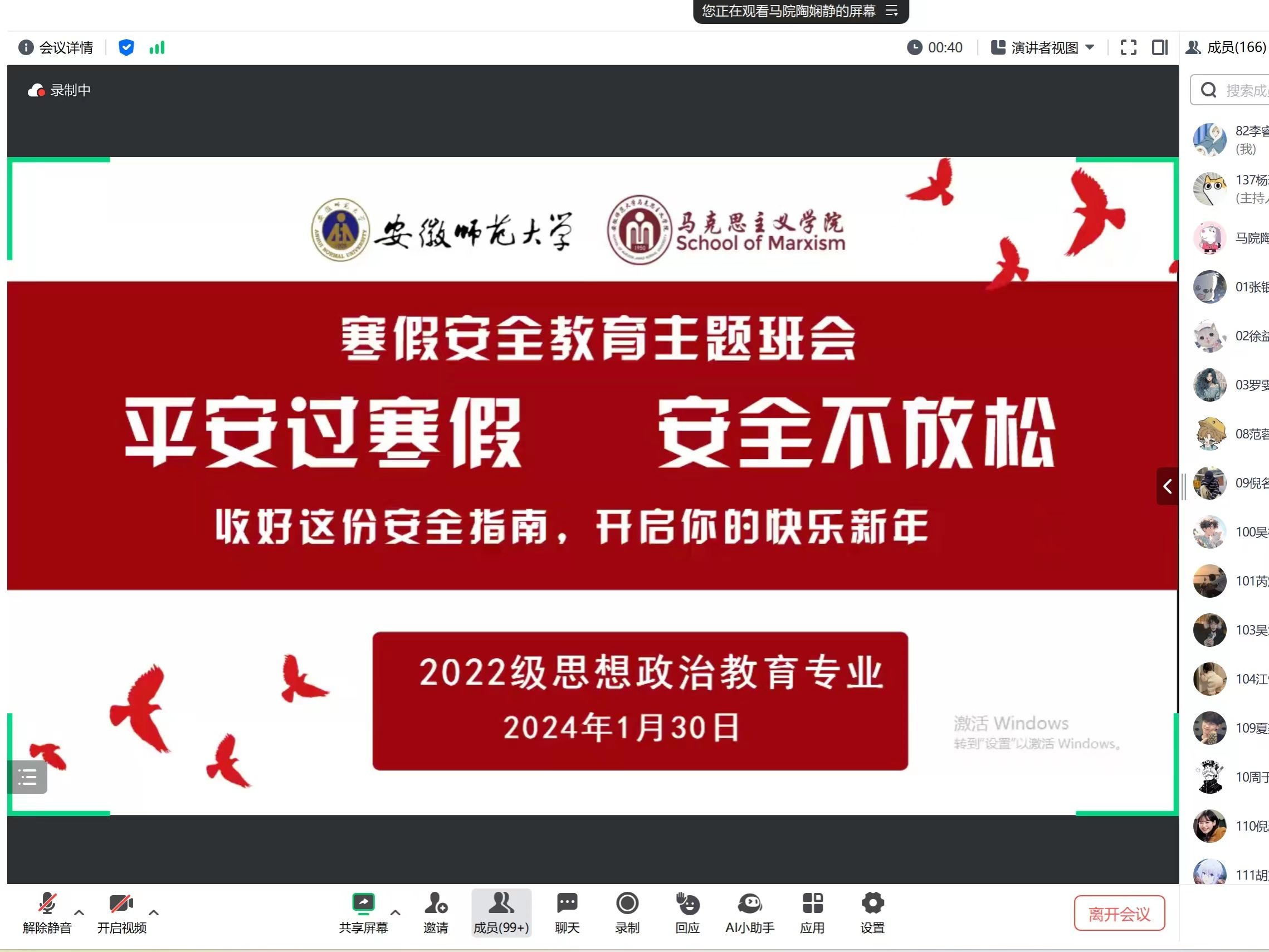 为进一步增强员工安全意识,保障员工假期安全,1月30日晚,2022级思想政治教育专业线上开展“平安过寒假,安全不放松”寒假安全教育主题班会。会议由辅导员陶娴静主持,全体同学参加。