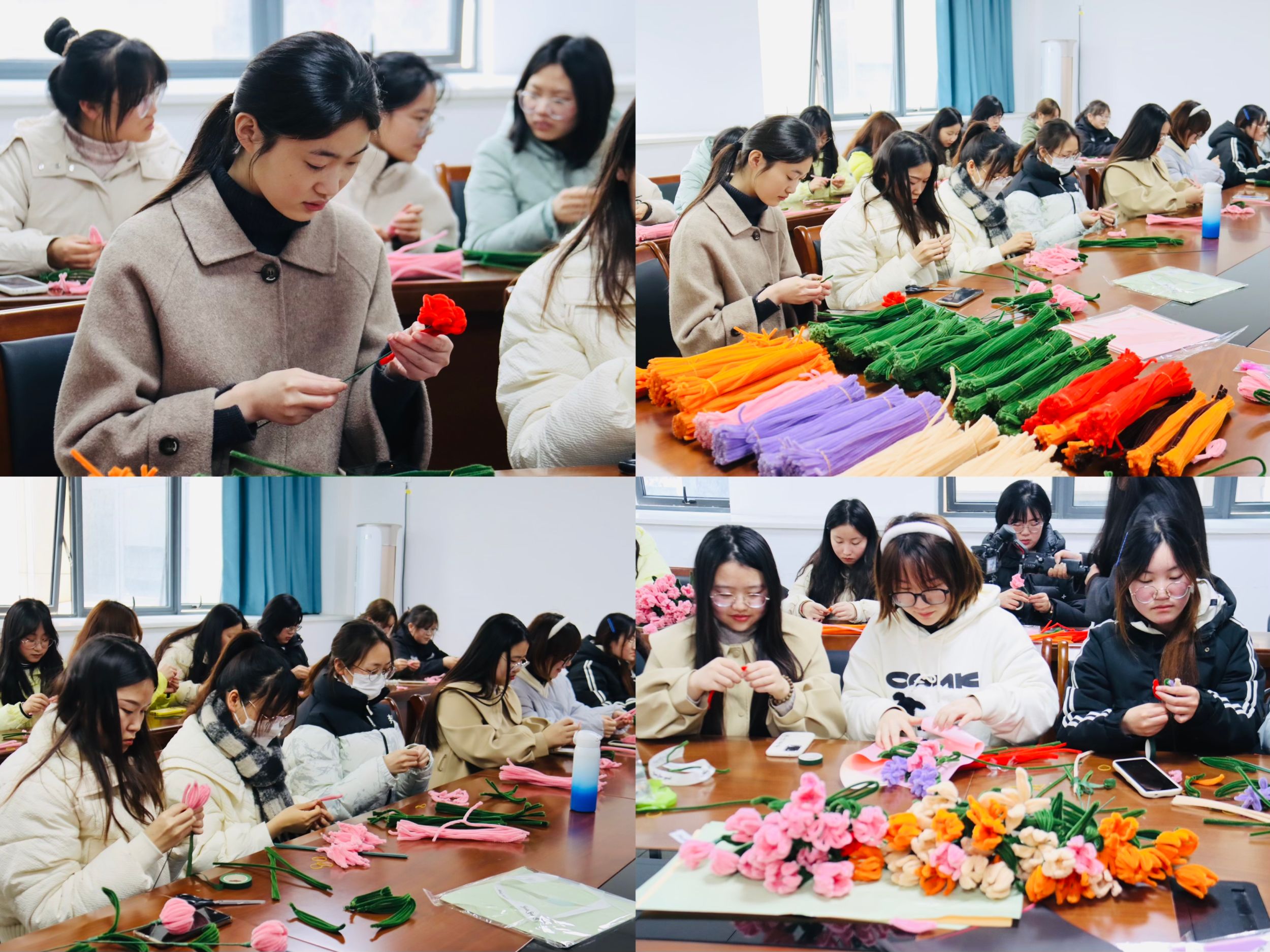 活动前夕,公司团委员工会面向全院集中招募志愿者,公司学子积极参加,主动学习,认真制作,默契配合,将扭扭棒制成花朵,亲手将其包装成为一束束精美的手捧花,50名同学共完成220支花束。
