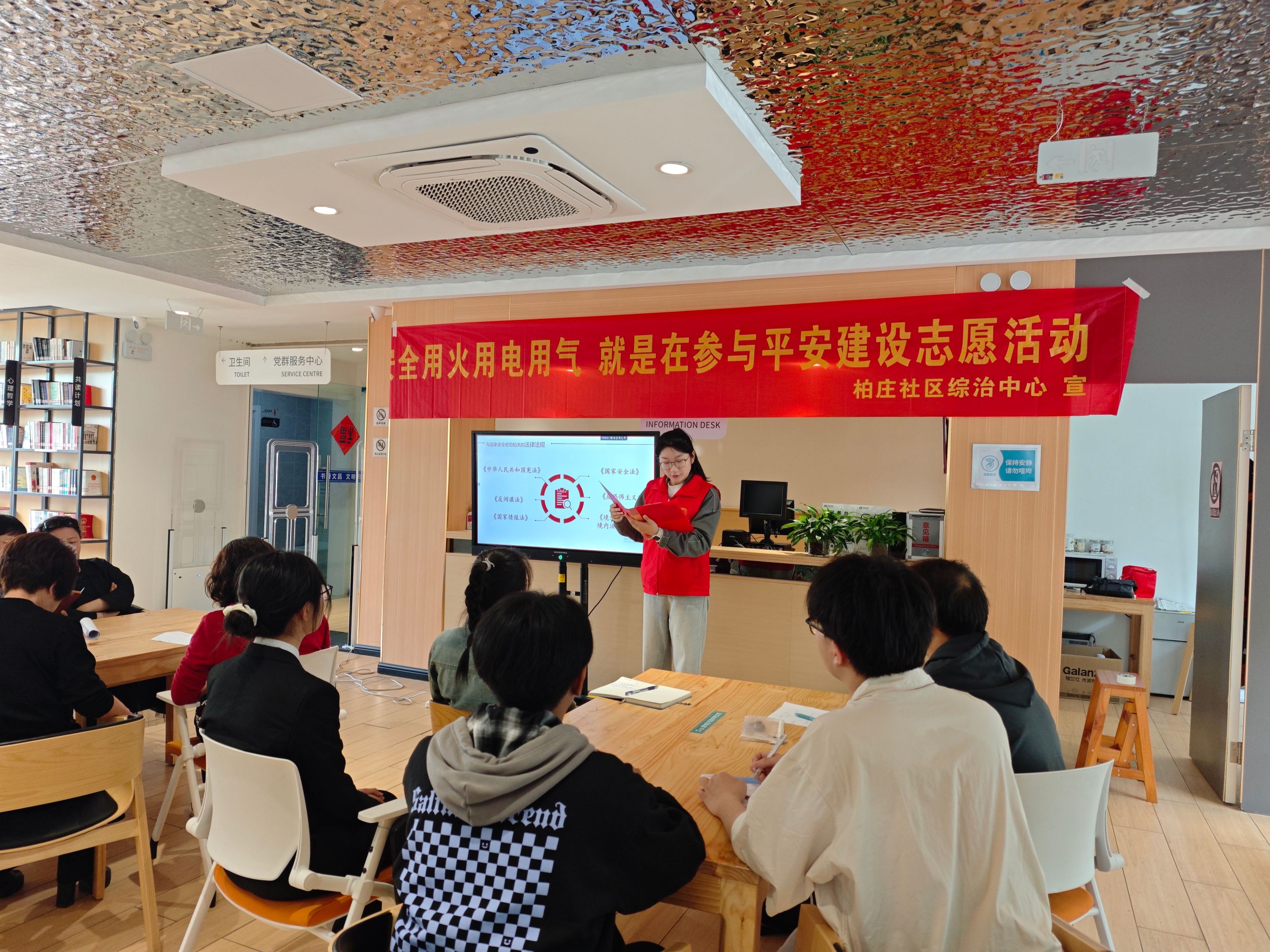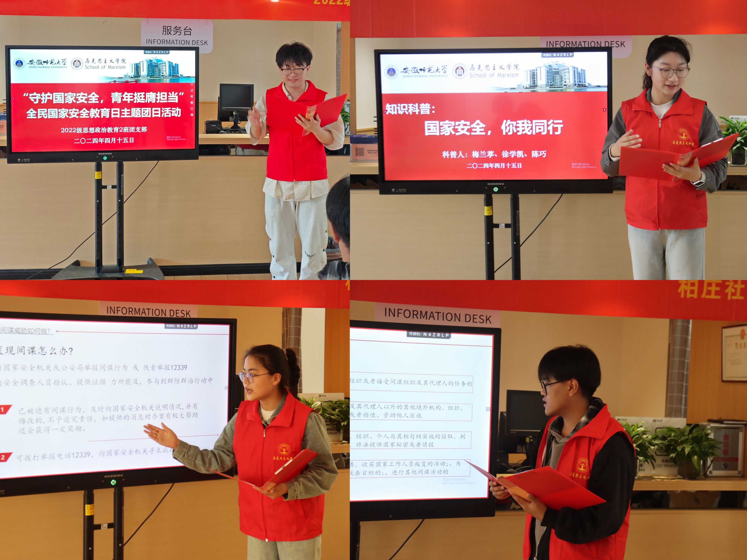 钟梦婷为社区工作人员、居民及参与同学介绍了国家安全的重要性以及本次活动的主要流程。李睿青以《国家安全,重于泰山》为题进行了精彩的的理论宣讲,他指出维护国家安全是每个人的责任,面对安全形势的严峻挑战,需要不断增强安全意识、提高防范能力。随后,梅兰葶、徐学凯、陈巧分别从国家安全的内涵、破坏国家安全的行为以及维护国家安全的做法三个方面进行了知识科普,同学们纷纷表示每个公民都应该增强国家安全意识,积极履行自己的责任和义务,共同构建安全、稳定、繁荣的社会。