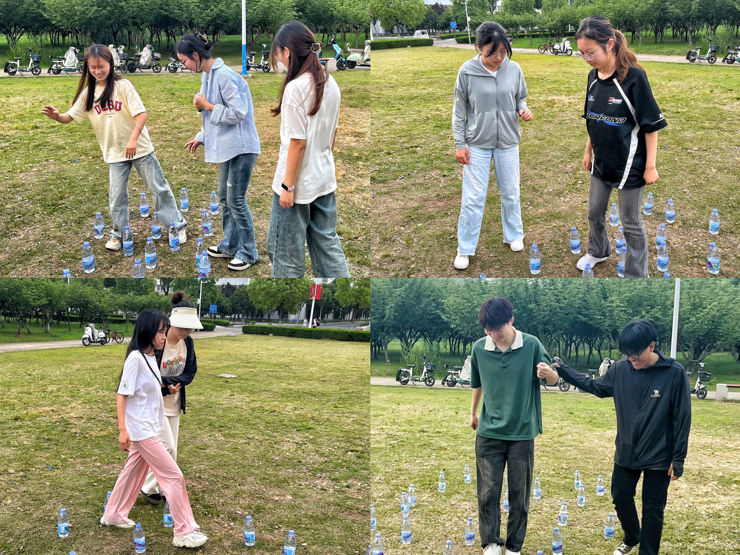 团队协作,共渡难关。蒙住眼睛的同学在团队其他成员的指挥下,走过水瓶布置而成的小闯关,考验了小队成员的默契和团队凝聚力。