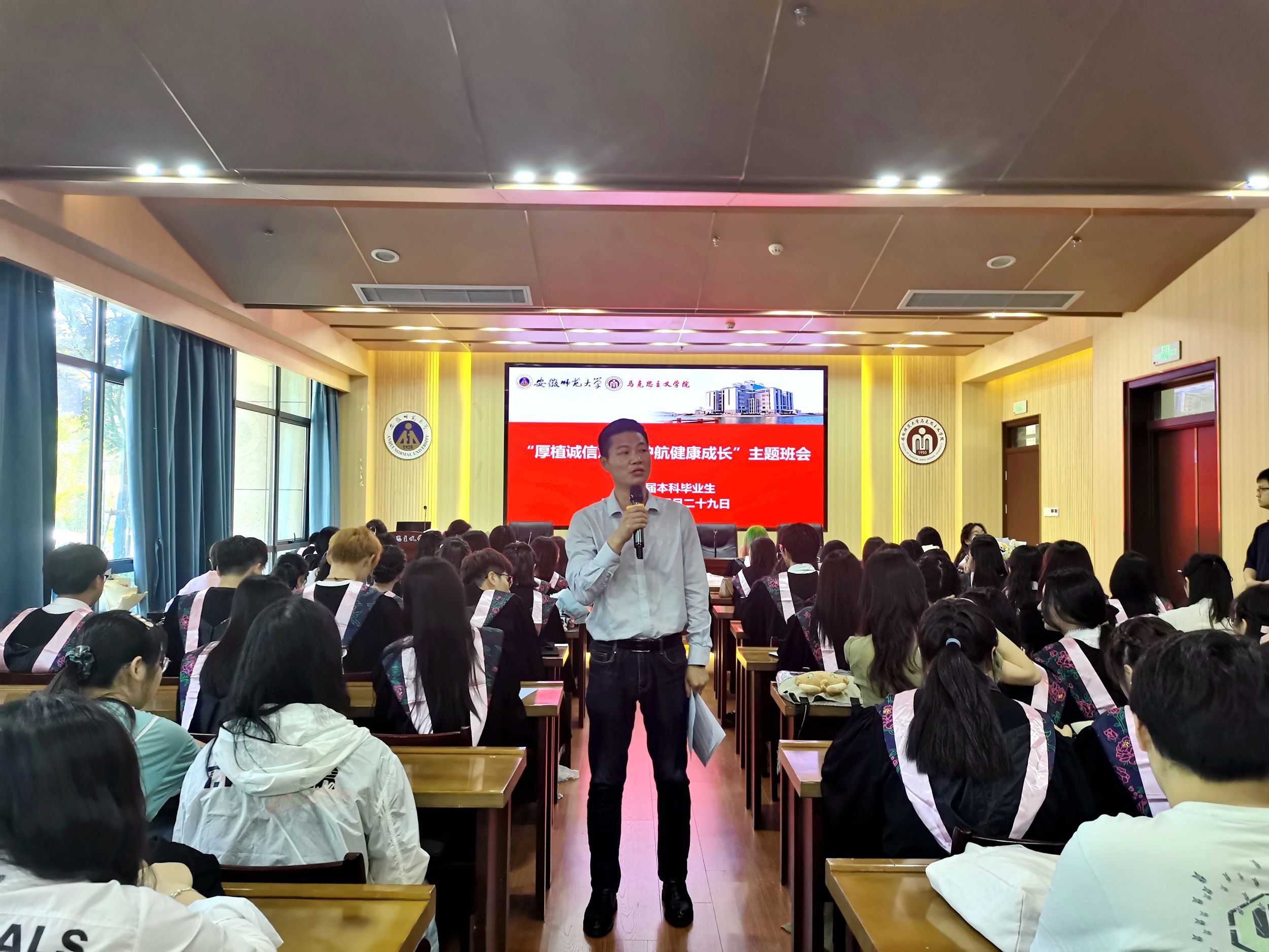 5月29日下午,beet3652024届本科毕业生在文典楼G108报告厅召开了“厚植诚信意识 护航健康成长”主题班会,会议由2020级本科生辅导员夏盼盼主讲,全体2020级本科生参加。