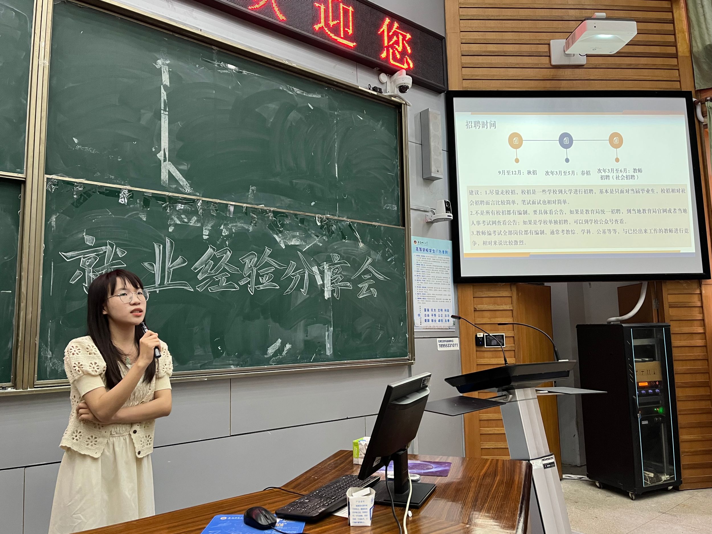 徐斯艺从招聘信息、课本内容、心态调整三方面进行了分享。她提醒同学们要重视对课本内容的熟悉,提高自己的专业素养,在面试过程中,要发掘一些创新点,展现出自己在教学设计方面的“小巧思”,更有利于给面试官留下深刻印象。