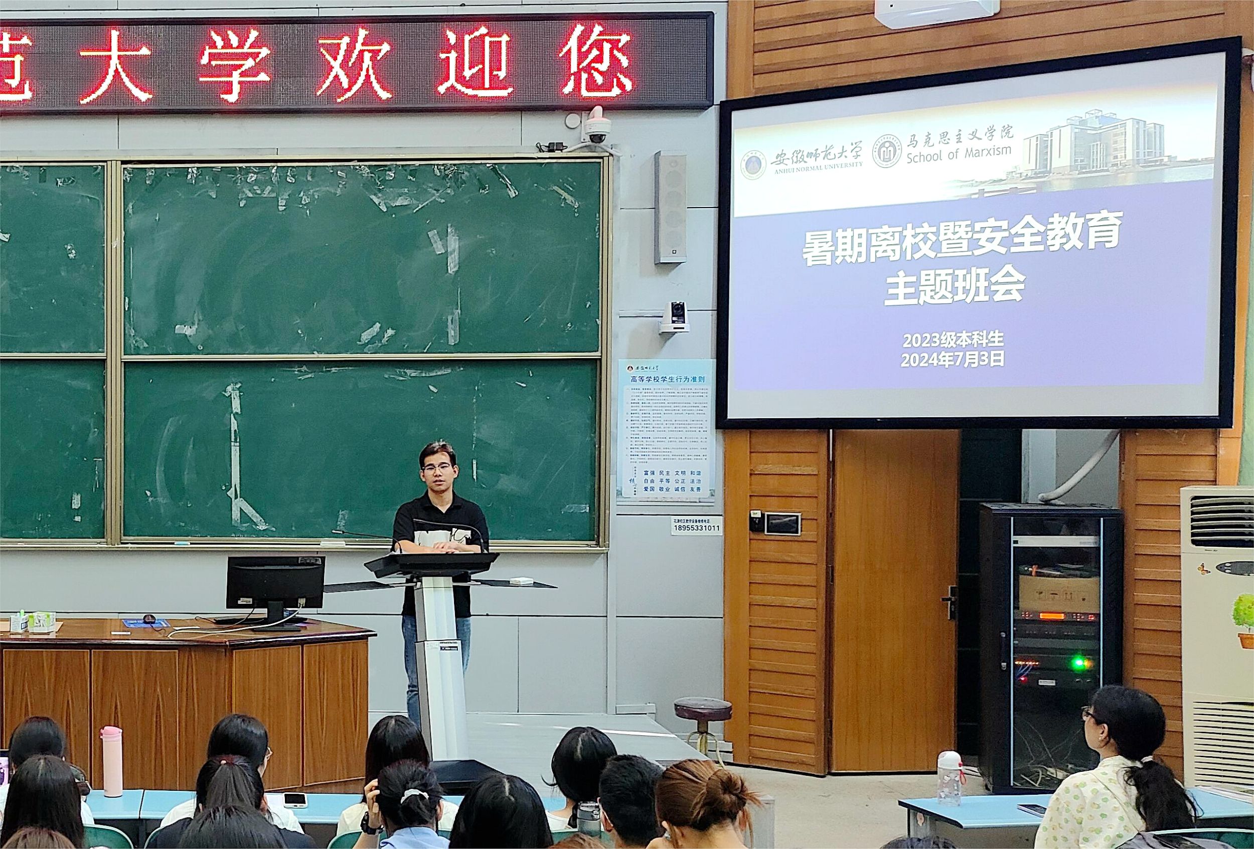 为进一步做好员工暑期离校安全教育工作,引导员工树立安全意识和责任意识,提高安全防范技能,筑牢安全防线,7月3日下午,beet3652023级本科生在2010105教室召开了暑假离校暨安全教育主题班会。班会由辅导员王梦雨主持,全体员工参加。
