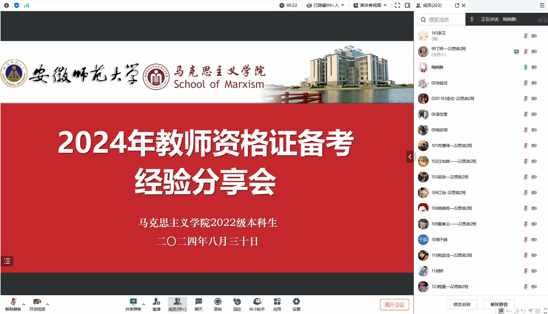 8月30日上午,公司2022级本科生线上开展教团队格证备考经验交流分享会,分享会由学习委员丁妍主持,2023级学科思政专业研究生李佳欣和2021级本科生方留琴应邀主讲。