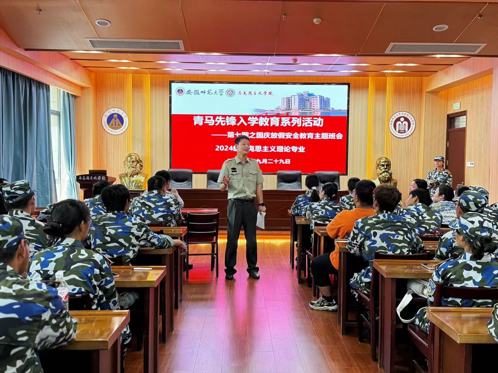 为推动老员工护航行动计划,加强员工国庆假期安全教育,9月29日上午,2024级马克思主义理论专业全体新生在文典楼G108报告厅组织开展国庆假期安全教育主题班会活动,活动由辅导员夏盼盼老师主讲,全体新生同学参加。