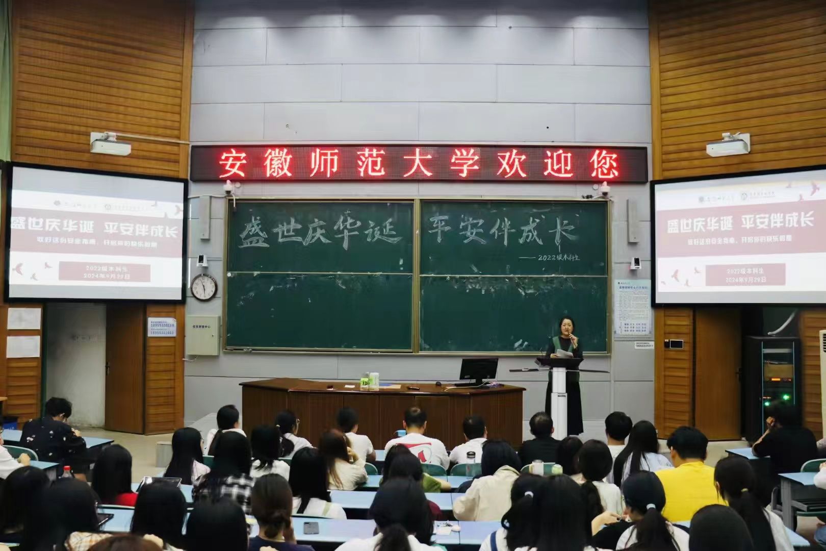 为增强员工安全意识,保障员工出行安全,9月29日下午,2022级本科生在行知楼2010105教室开展“盛世庆华诞,平安伴成长”国庆离校安全教育主题班会。会议由辅导员陶娴静主持,全体同学参加。