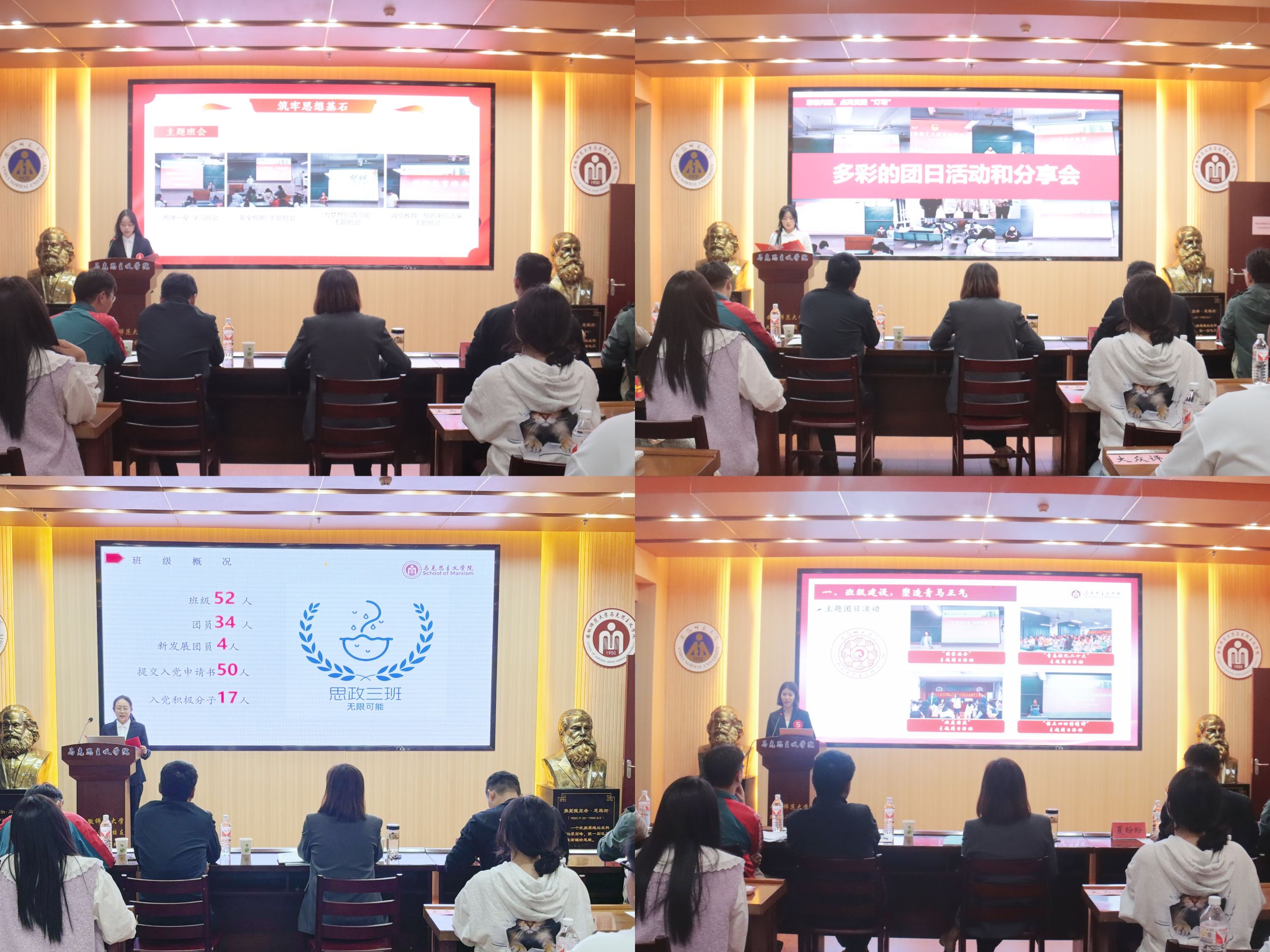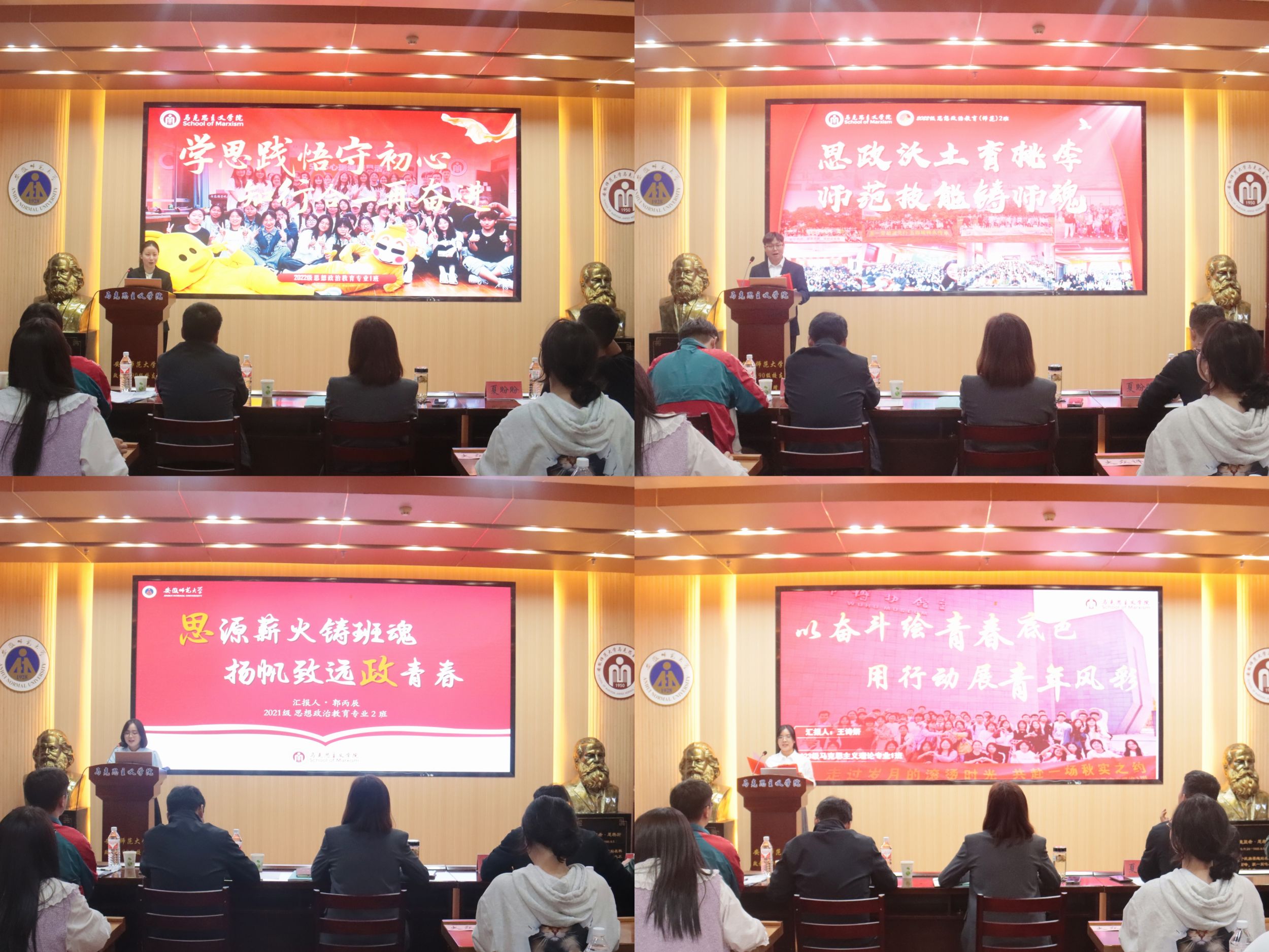 经过审核筛选,本次共计8个班级参与评选。21级思政2班以“思源薪火铸班魂,扬帆致远政青春”为题,讲述思政人明德笃行,求真尚美的奋斗历程;22级马理论1班以社会实践为抓手,凝心聚力,挺膺担当,坚持在实践中受教育、长才干、做贡献;22级思政1班坚持“三学”育人,以学增智,以学正风,以学促干,在知行合一中不断奋进;22级思政2班擦亮师范底色,深耕思政沃土,以实际行动书写师范生的成长故事。