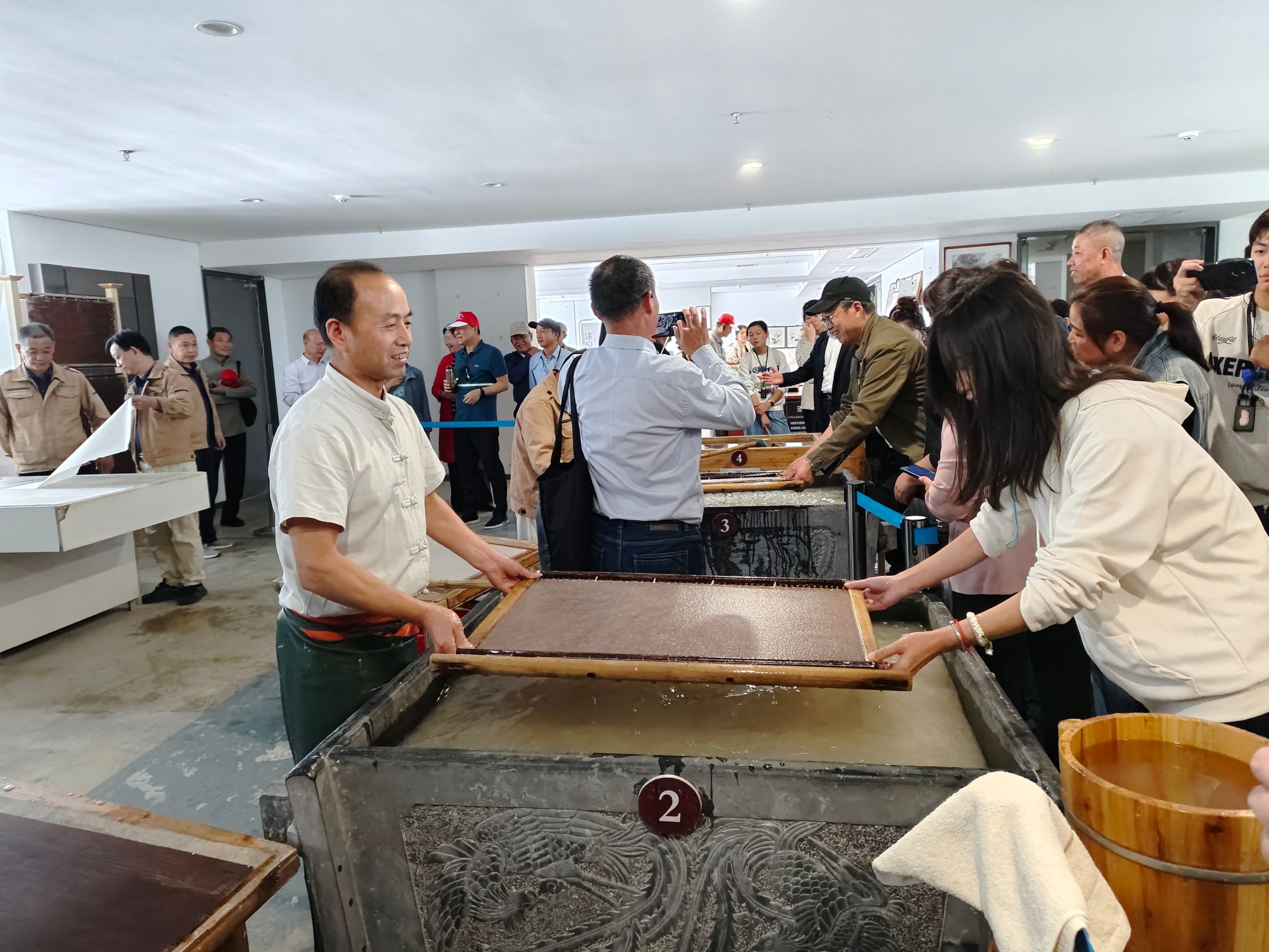 师生们先后参观了中国宣纸博物馆、“三丈三”巨宣生产车间、宣纸技艺展示区以及非遗体验区等场馆。在宣纸技艺体验园区,姚老师和同学们深入交流宣纸制作的六大工艺流程和108道细分工序,讲述宣纸1500多年的悠久历史。此外,师生们亲身体验了宣纸制作,深刻领略了宣纸文化,展现了工艺师傅们追求卓越的工匠精神和中华传统文化的深厚底蕴。