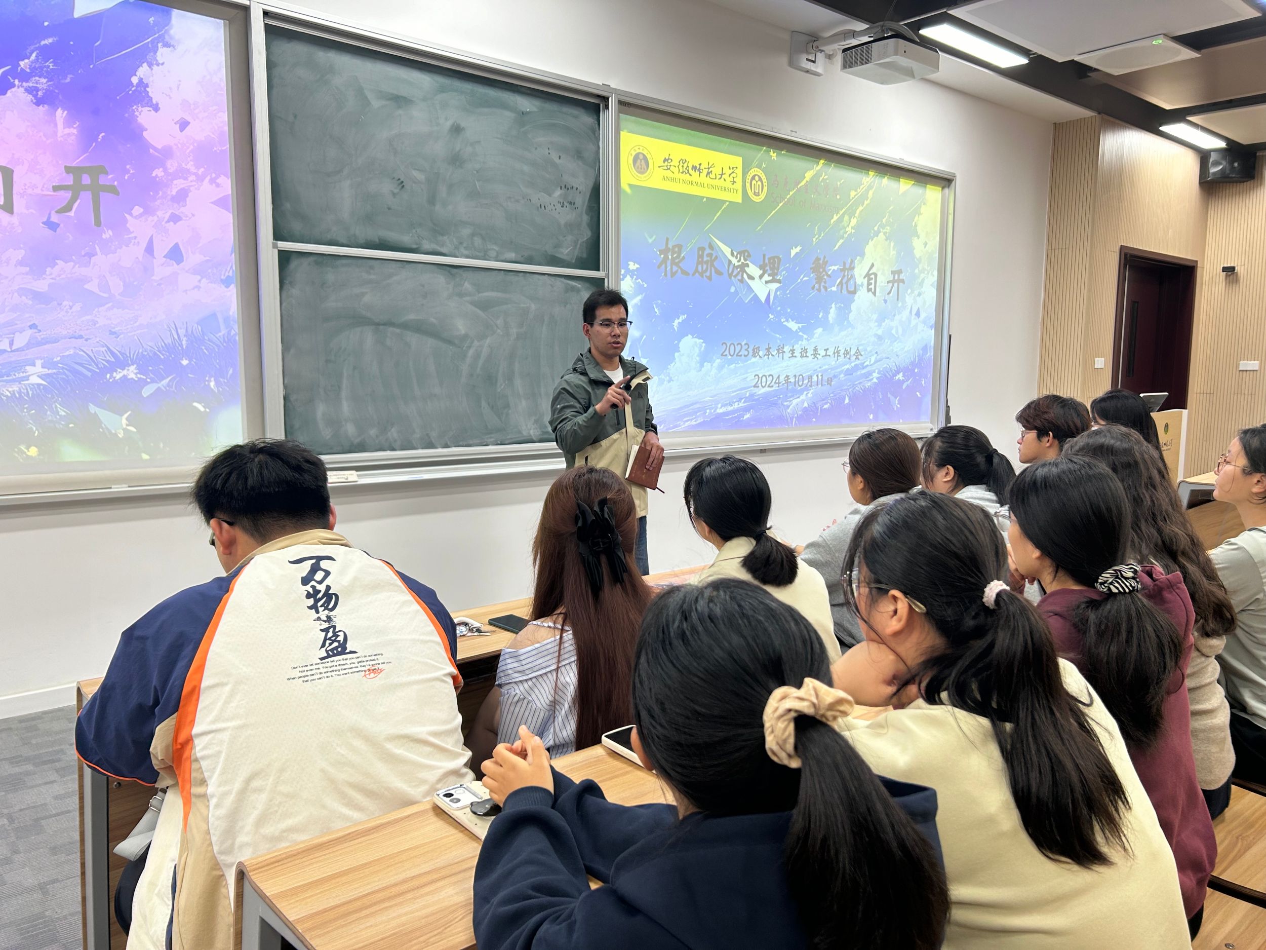 为扎实有效推进2024-2025学年班级建设工作,加强班委的管理意识与责任感,10月11日晚,在望道楼B101教室召开2023级本科生班委工作例会。此次会议由2023级本科生辅导员王梦雨老师主持,2023级全体班委参会。