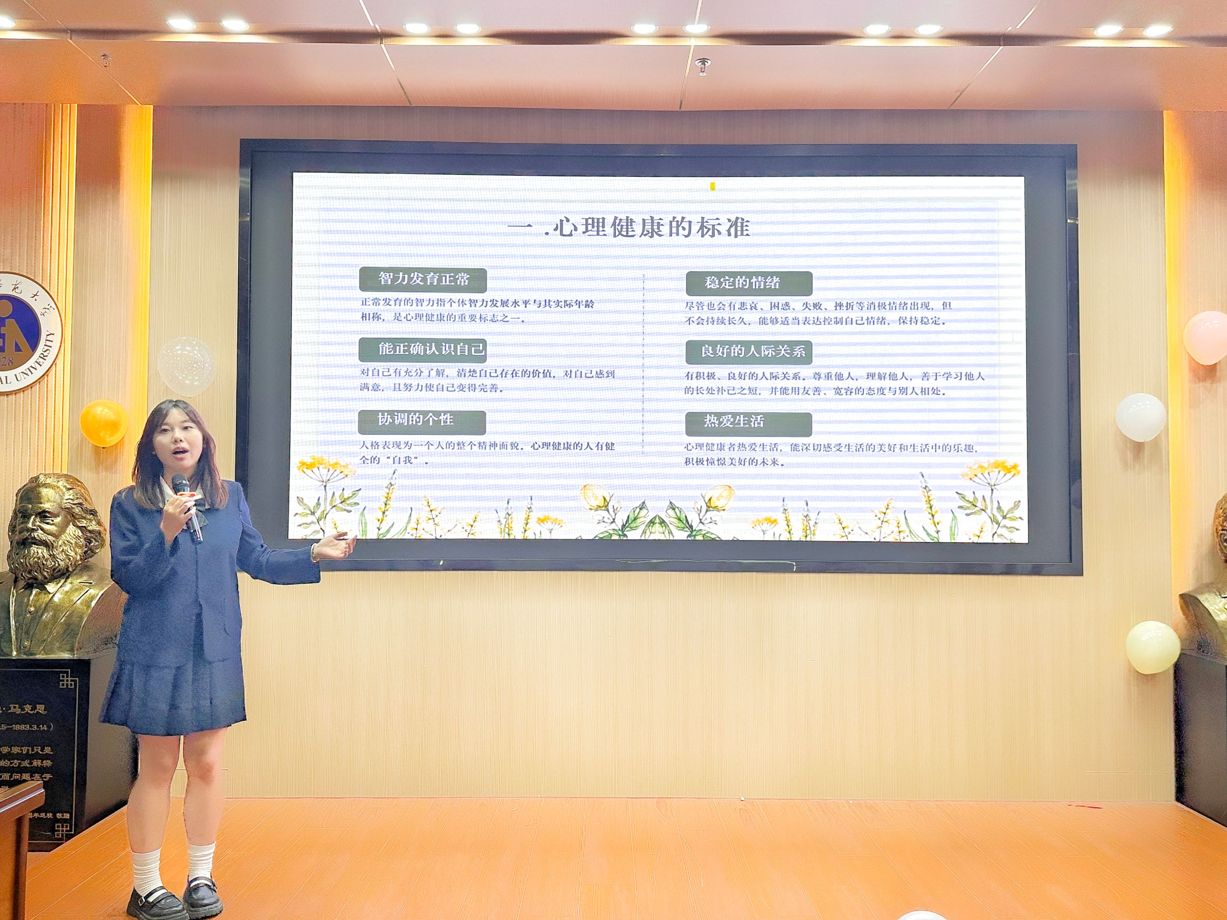 理论宣讲学知识。徐子乐、相满意向同学们讲解了心理健康的相关理论知识,为同学们提供了心理咨询的途径,鼓励同学们敞开心怀,乐观面对挫折。同学们纷纷在“心晴表”上留下一个个笑脸,描绘出自己此刻的期待与喜悦。