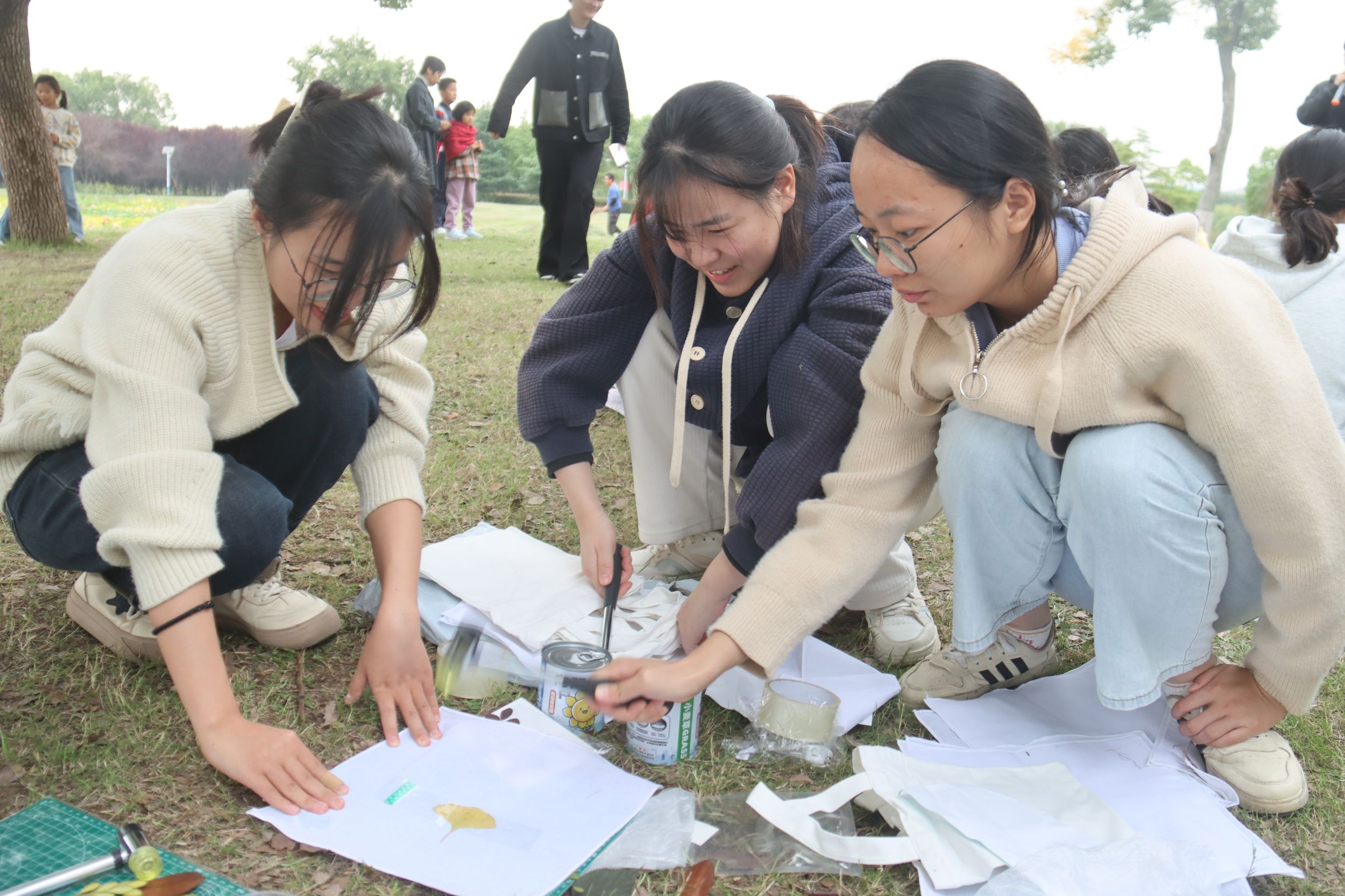 植物拓染亲自然。同学们拾取秋日落叶,通过敲击在纤维材料上进行染色,在亲手制作植物拓印中感受中国传统草木拓印的文化魅力,让美好的回忆具体化为缤纷的色彩。班级以植物拓染的独特方式,激发员工爱绿、护绿、亲绿的情感,在亲近自然的同时愉悦了心灵。