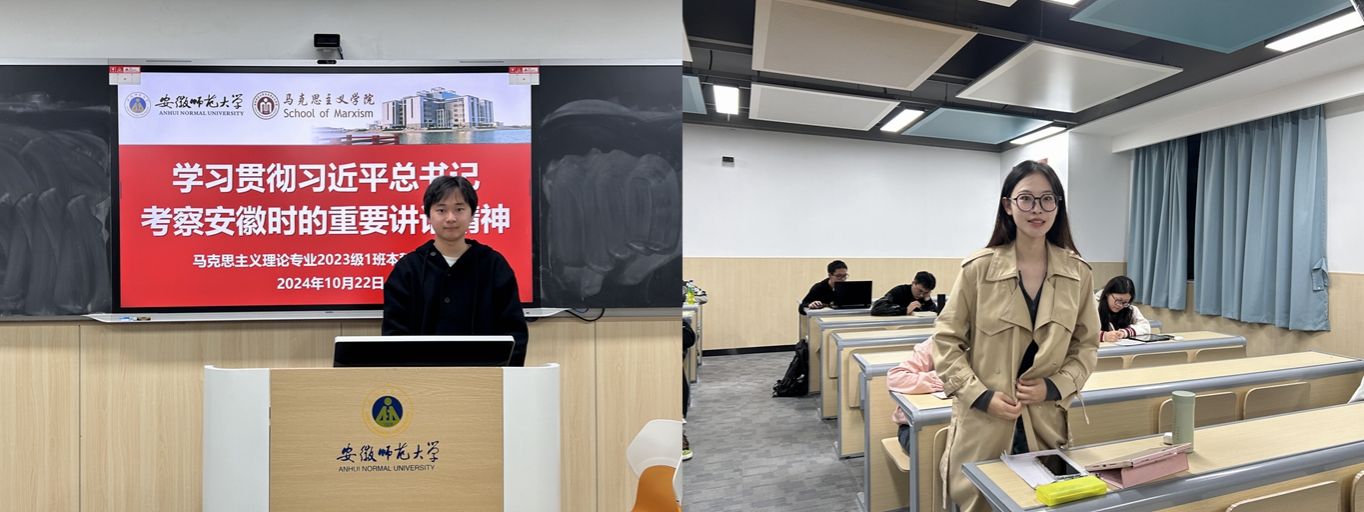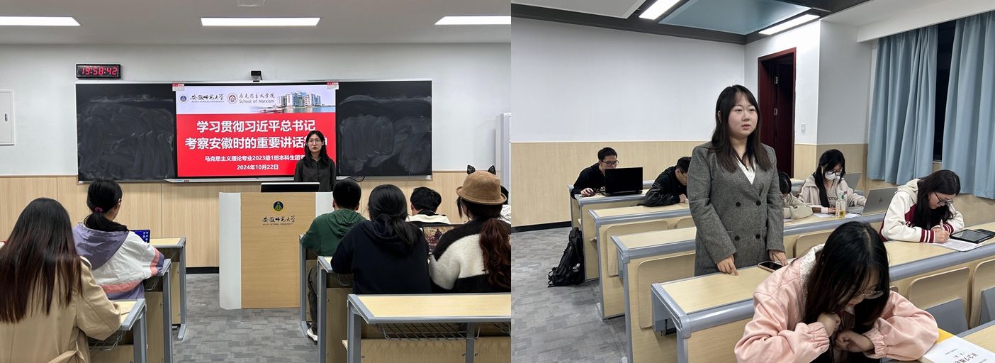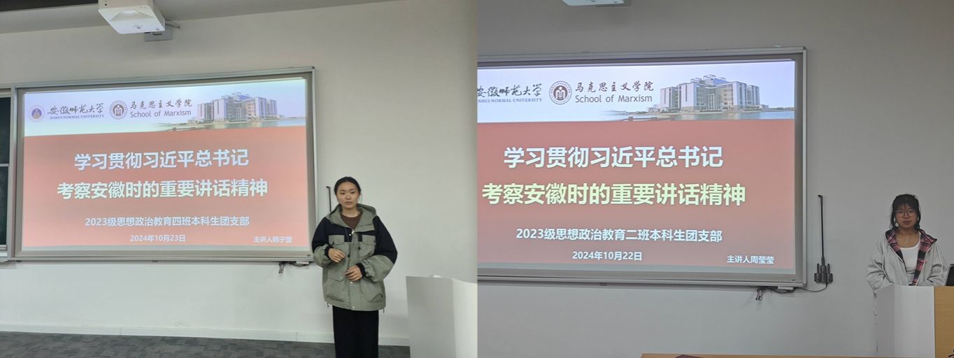会上,各班团支书领学习近平总书记考察安徽重要讲话精神,组织观看了相关报道和视频。马克思主义理论专业张思嘉表示,习近平总书记的重要讲话,为安徽未来发展把脉定向、指路引航,作为青年学子,我们要广泛凝聚共识,奋发有为,切实把习近平总书记的殷殷嘱托转化为美好现实。马克思主义理论专业罗衍俊以《学习习近平总书记考察安徽重要讲话精神》为题作主题宣讲。班级同学积极分享自己的学习心得。思想政治教育专业刘毅表示要学习把握好习近平总书记重要讲话精神,传承弘扬中华优秀传统文化,拿出“人生能有几回搏”的劲头,书写最美的青春篇章。