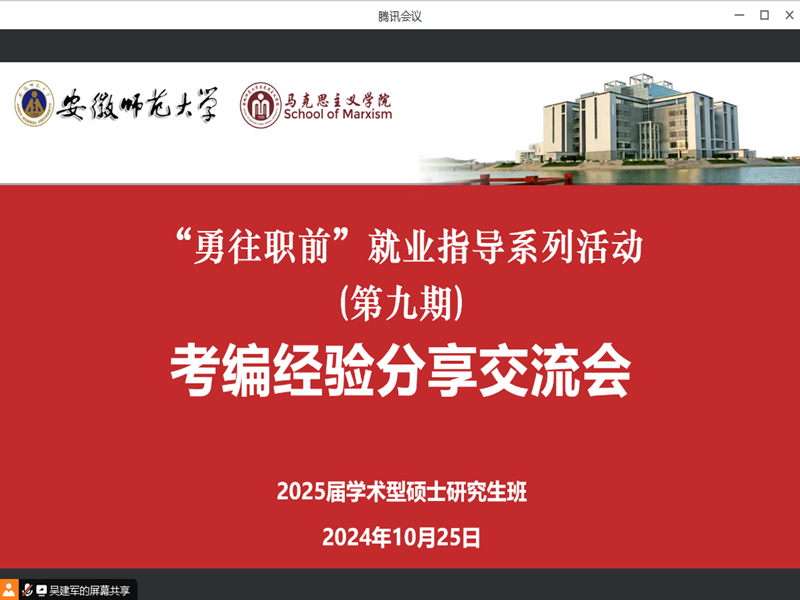 为帮助毕业生学习备考经验、增强就业竞争力,10月25日晚上,beet3652022级学硕班在腾讯会议召开考编经验分享交流会。分享交流会由2024届学科(思政)毕业生梁秋菊、王晨璐主讲,会议由吴建军主持,部分同学参会。