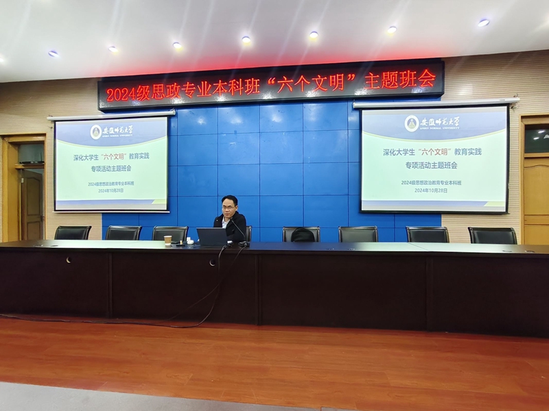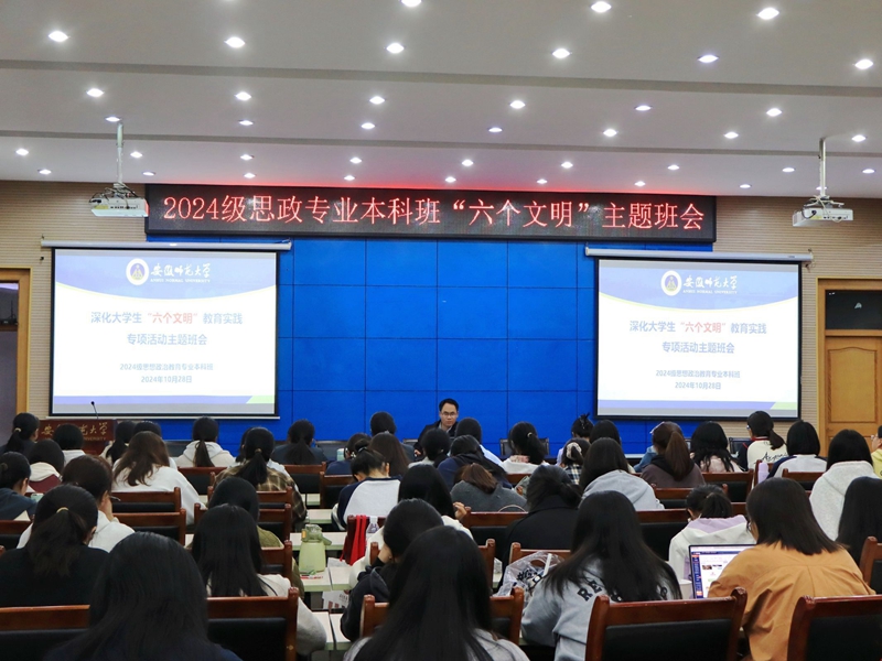 为进一步引导员工养成良好的文明习惯,10月28日晚上,2024级思想政治教育专业本科班在会议中心第三报告厅召开深化老员工“六个文明”教育实践专项活动主题班会。本次班会由辅导员周楠主讲,班级全体同学参加。